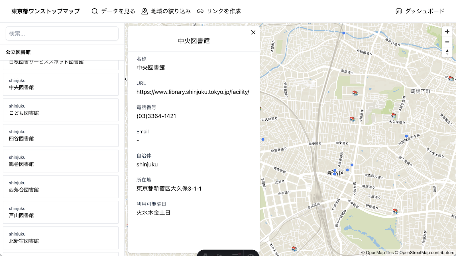 私たちが開発した「東京都ワンストップマップ」は、東京都のオープンデータを「ワンストップ化」するWebマップです。 ① 一般ユーザーは、様々なオープンデータの内容を、通常の地図アプリのように表示することができます。ユーザーは、自治体や種類を選択して簡単に情報にアクセスできます。それぞれの情報に応じて、このアプリの外の、様々なオープンデータの活用事例やアプリにも飛べるようにする予定です。 ② もう一つの機能として、マップで提供しているデータのダッシュボードも開発しました。行政の担当者や、データを利用したい開発者は、データの種類ごとに各自治体のデータ網羅状況やデータの内容を一目で把握できます。データは複数自治体のデータを利用しています。(追加中)