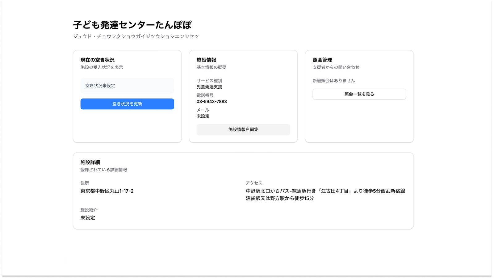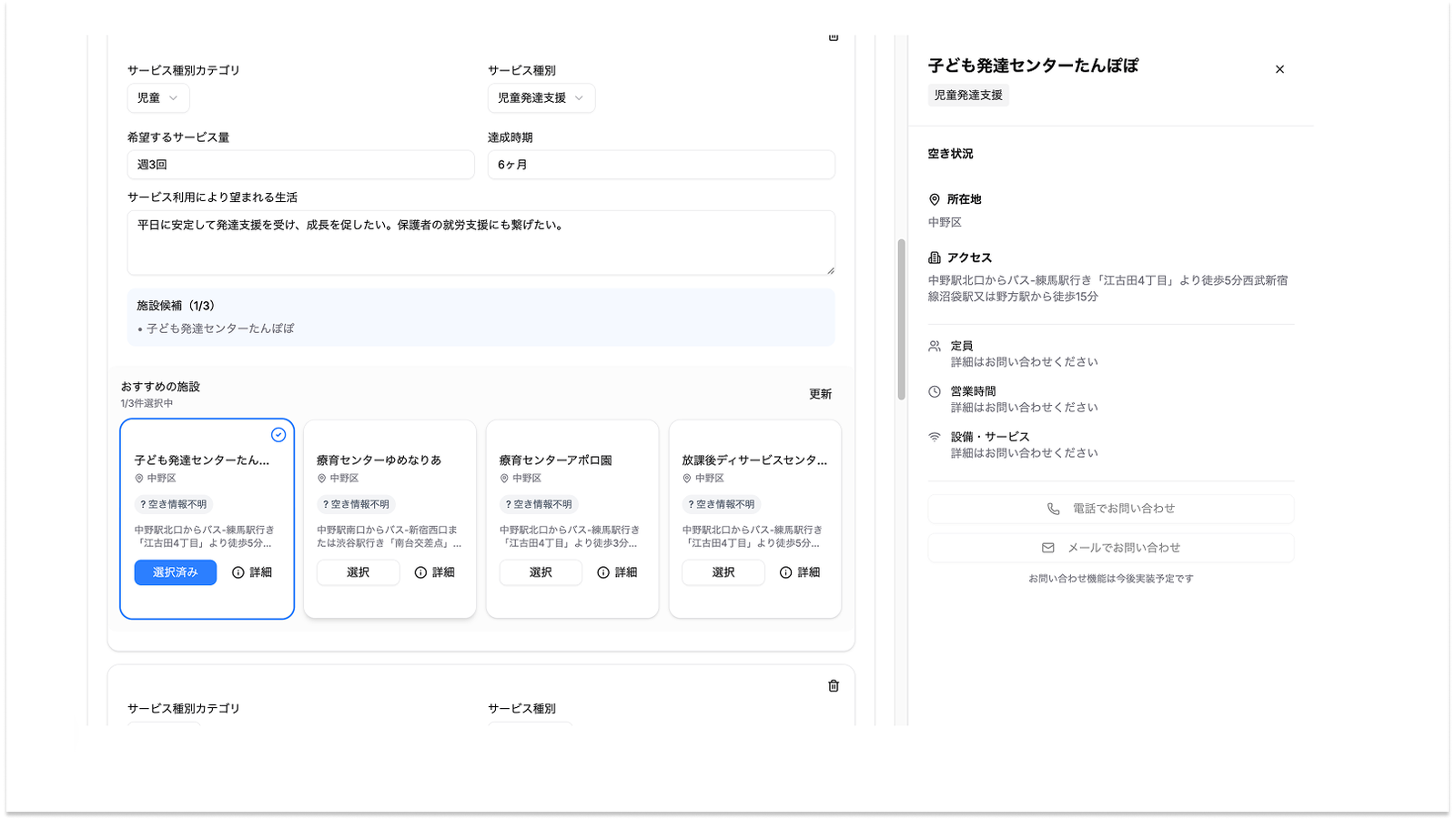 Care Hubは、東京都の障害福祉サービスにおける情報断絶を解消するプラットフォームです。相談支援専門員が面談中に本サービス上で支援記録を行うことで、希望条件や利用意向が自動的に整理され、児童発達支援や短期入所など複数サービスの空き状況をリアルタイムに把握可能。利用者は候補施設を即時確認・ワンタップ同意でき、計画書が自動生成されます。これにより、利用者の選択肢拡大と利用開始の迅速化、相談員の業務負荷軽減、行政による稼働率の可視化・施策立案支援を実現します。