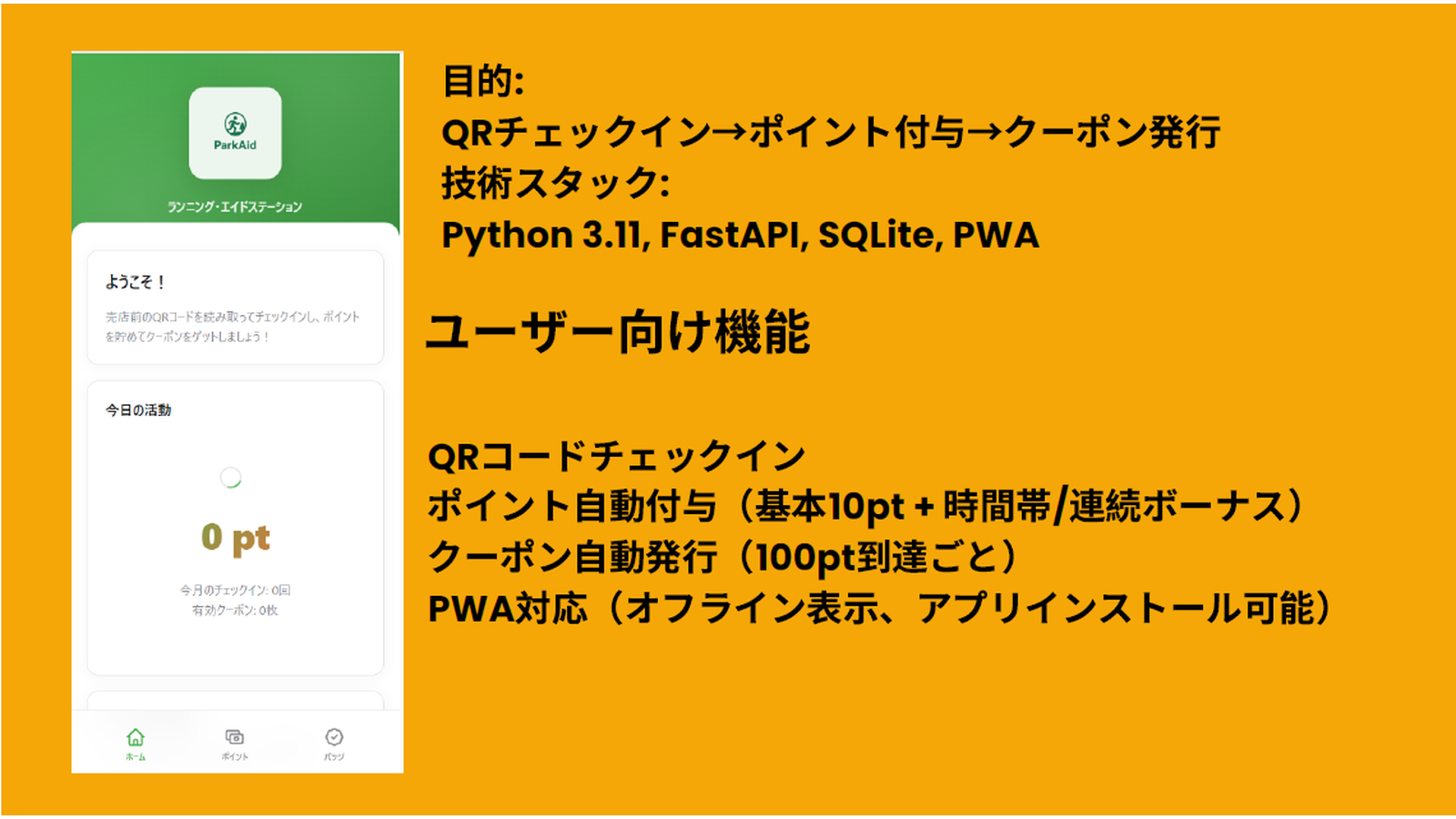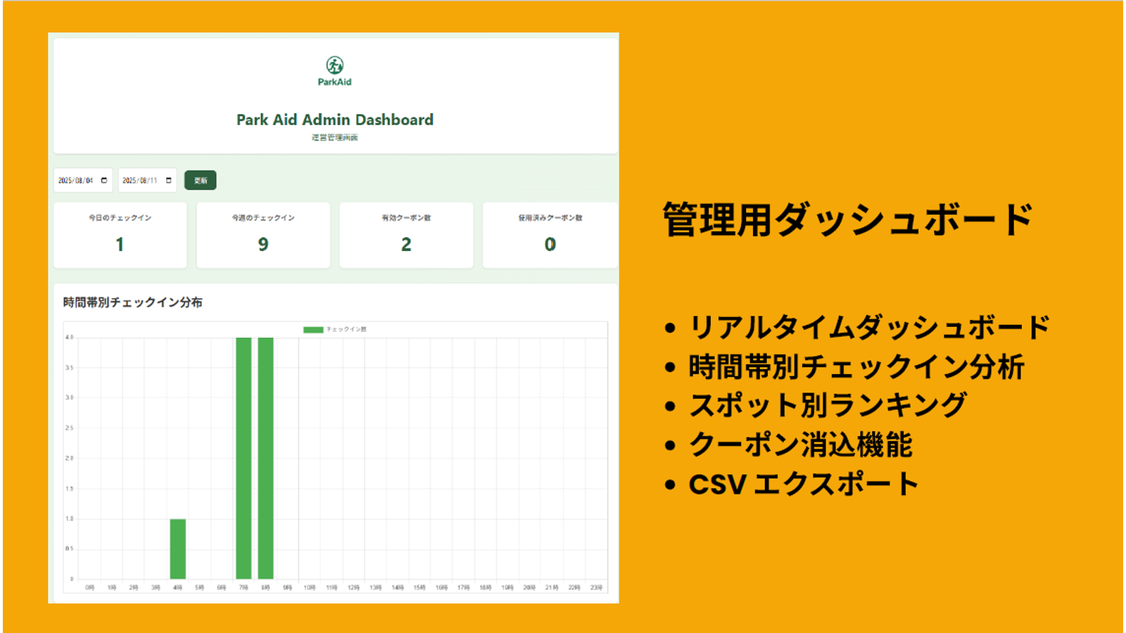 本提案では、公園を日常的に利用する住民を対象にした「PARK AID」という仕組みを構築し、観光客依存からの脱却と店舗の持続的活性化を目指します。具体的には、ウォーキング・ランニング・ペット散歩客が利用しやすい商品(飲料、ケア用品、ペット関連グッズなど)を無人販売や早朝・夜間対応で提供します。また、来園者はQRコードでチェックインし、ポイントを獲得、一定ポイントでクーポンが発行される仕組みを導入します。利用データはダッシュボードで管理し、時間帯やスポット別の利用状況を可視化。これにより、日常客の利便性を高めつつ消費を喚起し、店舗運営の効率化と地域住民に愛される持続的な公園経済圏を実現します。