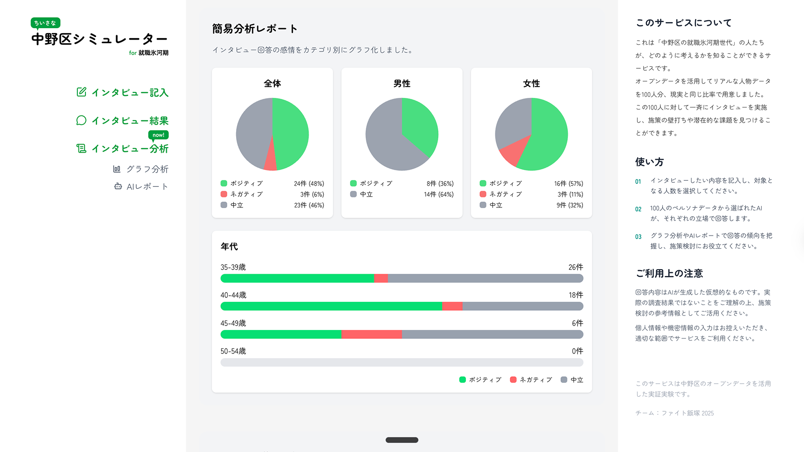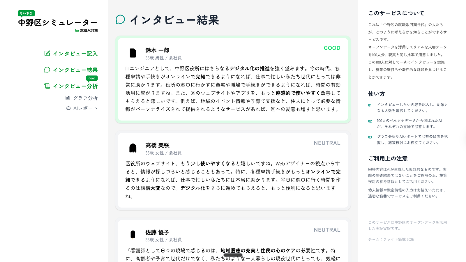 中野区の就職氷河期世代を対象とした施策検討を支援するため、国勢調査などのオープンデータを元にリアルな属性を持つ100人のペルソナ群を生成。 これらのペルソナ群に一括でインタビューを行い、各ペルソナのリアルな回答をAIが生成、感情分析や属性別集計を提供する。 自治体職員は、個々の意見の信頼性に依存せず、潜在的な課題を発見し、実際の施策立案や市民へのインタビュー設計の精度を高めることができる。