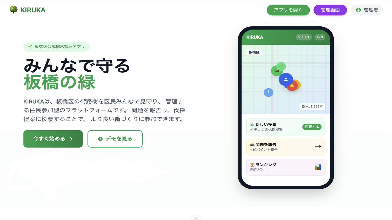 「KIRUKA(キルカ)」は、住民参加型の樹木管理アプリです。危険な樹木を「見つける」「知らせる」「共有する」ことを目的に、写真撮影・状態選択・送信の簡単3ステップで、住民が気づいた情報をリアルタイムにマップへ反映できます。行政は住民の「生の声」をもとに効率的な伐採計画を立案でき、必要に応じて投票機能で区民の意見を反映可能です。導入効果として、危険の可視化、住民目線の情報収集、当事者意識の醸成が期待されます。さらに将来的には、いたばしPayとの連携、伐採木材の利活用提案、自治体と業者のマッチングなどを通じ、樹木のライフサイクル全体を支える協働型プラットフォームへと発展していきます。