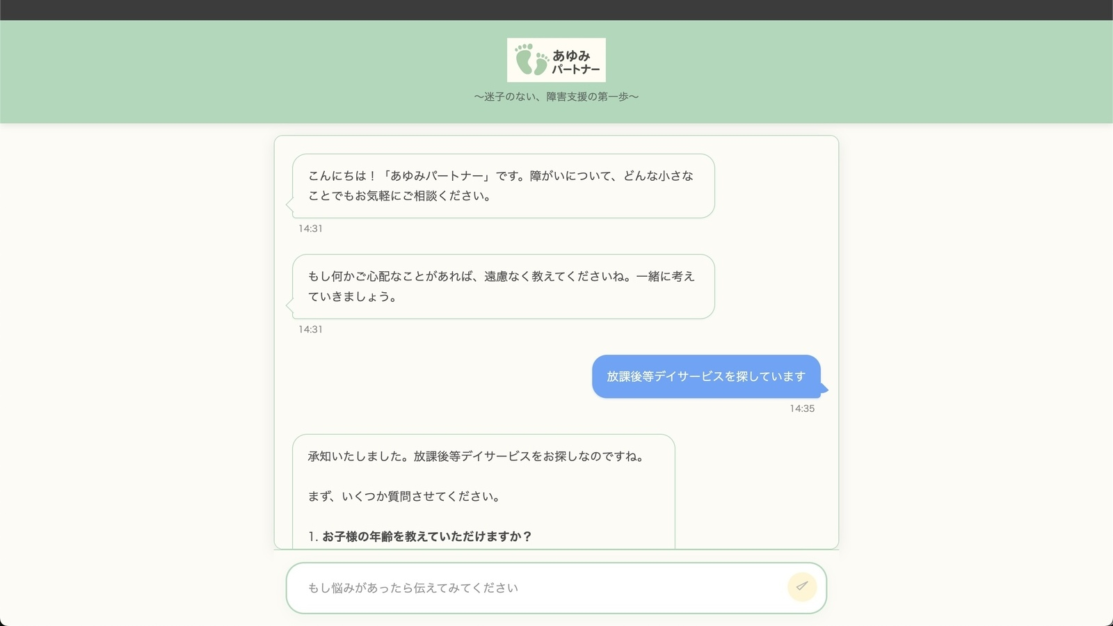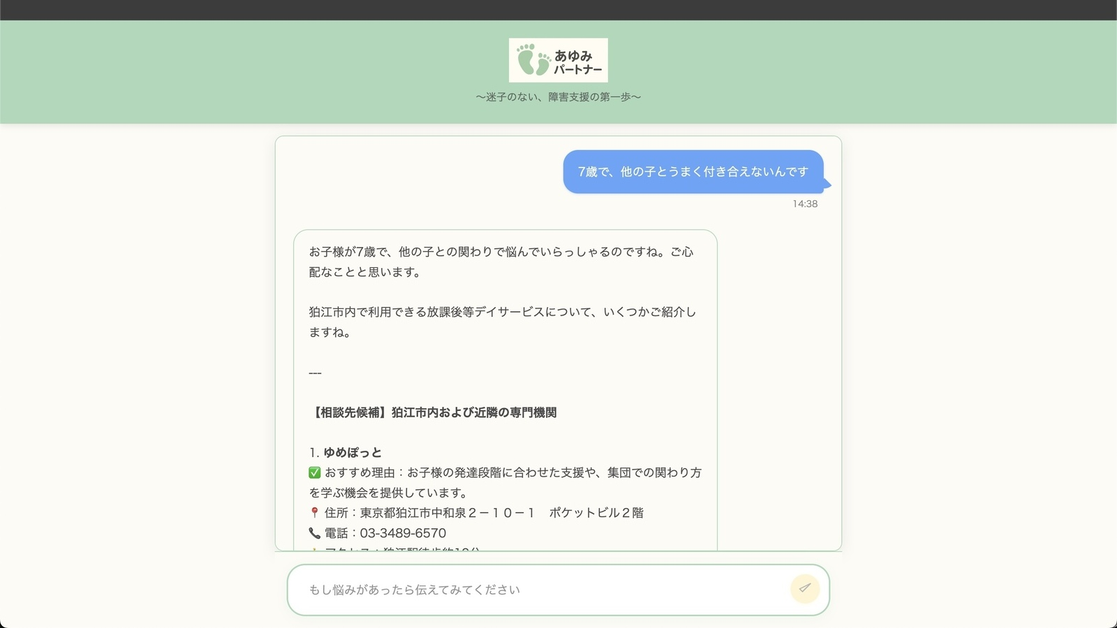 本成果物「あゆみパートナー」は、障がいに関する困り事解決の第一歩に踏み出すため、ご本人やご家族に寄り添うAIチャット相談員です。Google CloudのVertex AI (Gemini) を活用し、日常の言葉や曖昧な不安を「翻訳」し、専門的な情報への橋渡しを行います。 「事業所一覧」などの狛江市に関するオープンデータを知識ベースとし、一人ひとりの状況に合わせた具体的な相談窓口や地域の事業所を提案。最終的に、AIとの対話内容は専門相談員へスムーズに引き継ぐためのインテーク情報として自動で構造化され、本人や家族が次の支援へ迷わず進むための「最初の道しるべ」となります。