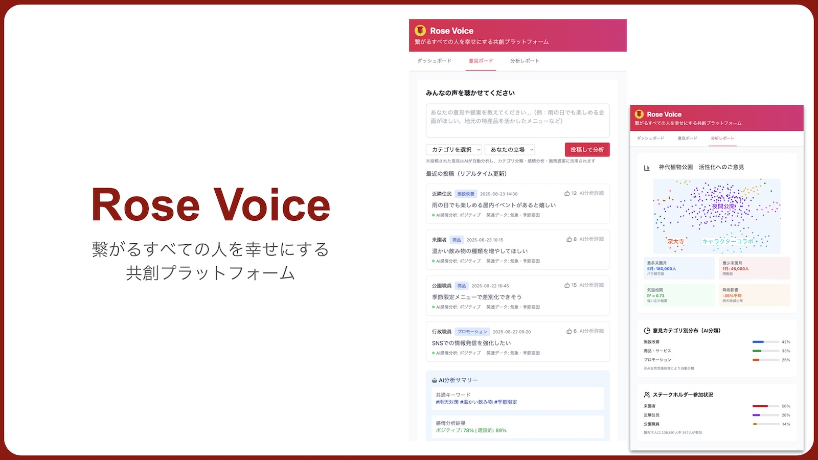 Rose Voiceは、行政がデータと利用者・地域住民の声を活用して意思決定を行える共創プラットフォームです。従来の一方的な行政運営ではなく、現場の意見や利用実態を反映することで、迅速かつ確実な政策形成を可能にします。利用者や地域住民は公園運営に参画し、主体的に意見を出すことで公園への愛着を深めます。その結果、地域住民が「公園のファン」となり、公園や売店の継続的な利用・支援につながります。行政にとっては透明性と合意形成力を高め、住民にとっては参加と交流の場を広げることで、持続可能な地域活性化を実現します。