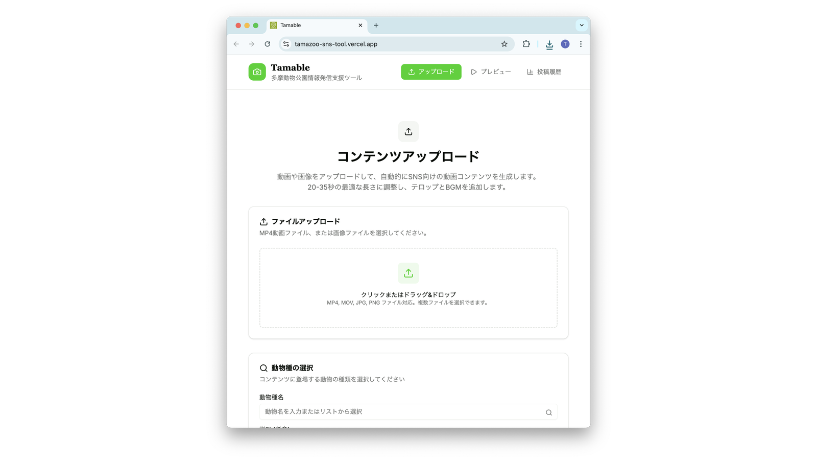 本提案は飼育員や広報担当の方が動物の動画や画像と合わせて動物情報や投稿条件などを入力するだけで、各プラットフォームの投稿形式に沿った動画や画像コンテンツを自動生成し、そのままInstagramやXに投稿できるWebアプリです。テロップや投稿本文の生成にはAIを活用し、来園者にわかりやすく魅力を伝える文章を作成します。一方で、映像のサイズ調整や尺調整、BGMやナレーションの合成などはプログラム処理で自動化します。さらに投稿履歴や簡易分析機能を備え、園内の動物種別データベースと連携して未発進の動物を把握することで、発信内容の偏りを防ぎ、園全体の魅力を持続的かつ網羅的に伝えることを可能にします。