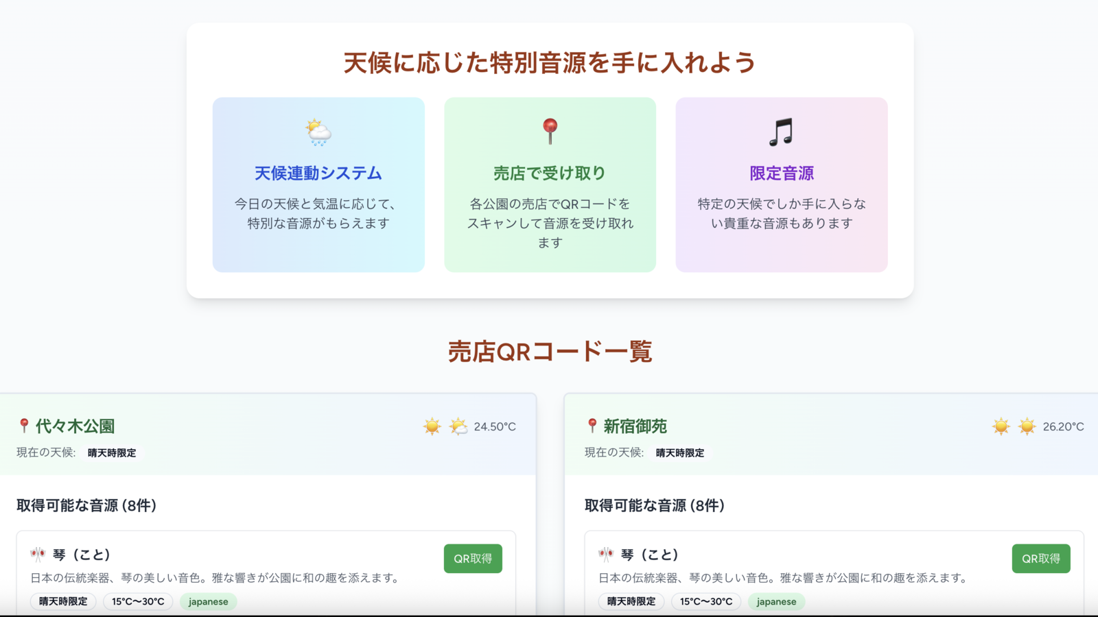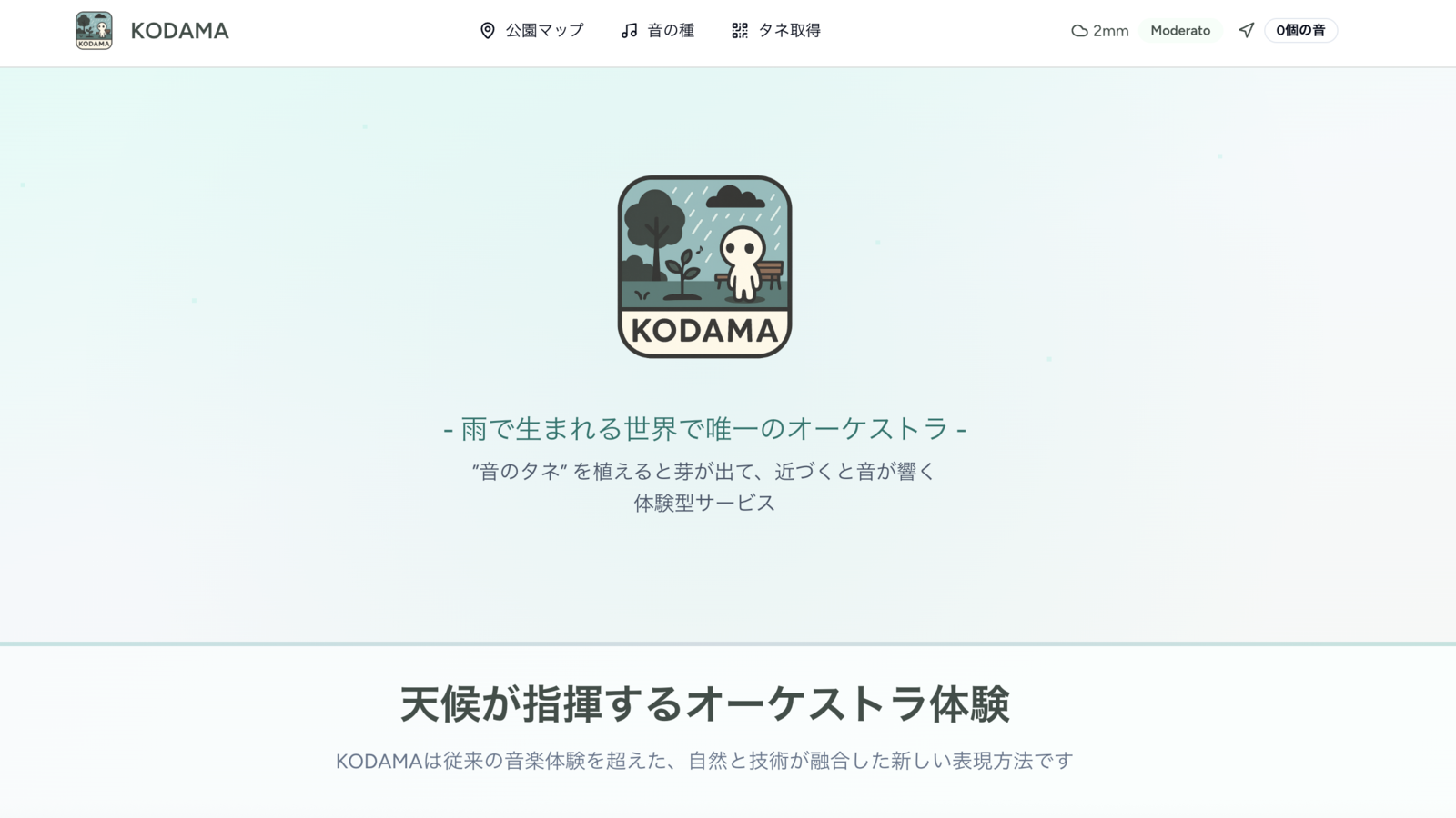 本提案「 KODAMA(木霊)」は、公園の閑散期、特に雨天時に来園者を呼び込み、売店の売上向上に貢献する体験型サービスです。来園者は売店で「音の種」を取得し、公園内の好きな場所に植えることができます。音の種は雨が降ると芽を出し、来園者が100m以内に入ると音が響き、公園全体がオーケストラのように奏でられます。これにより「雨の日でも公園に行きたい」という動機を創出し、売店を体験の起点かつ収益の場として活性化します。さらに、来園者の行動ログを取得することで、公園の人気スポットや回遊状況を分析でき、今後の売店配置やプロモーション戦略にも活用可能です。