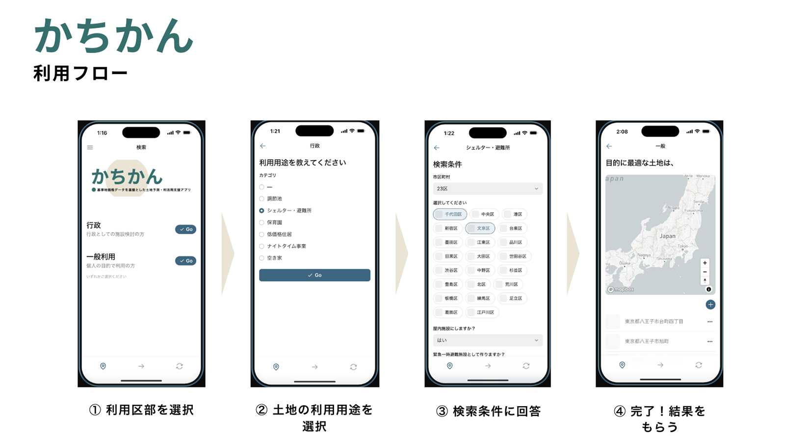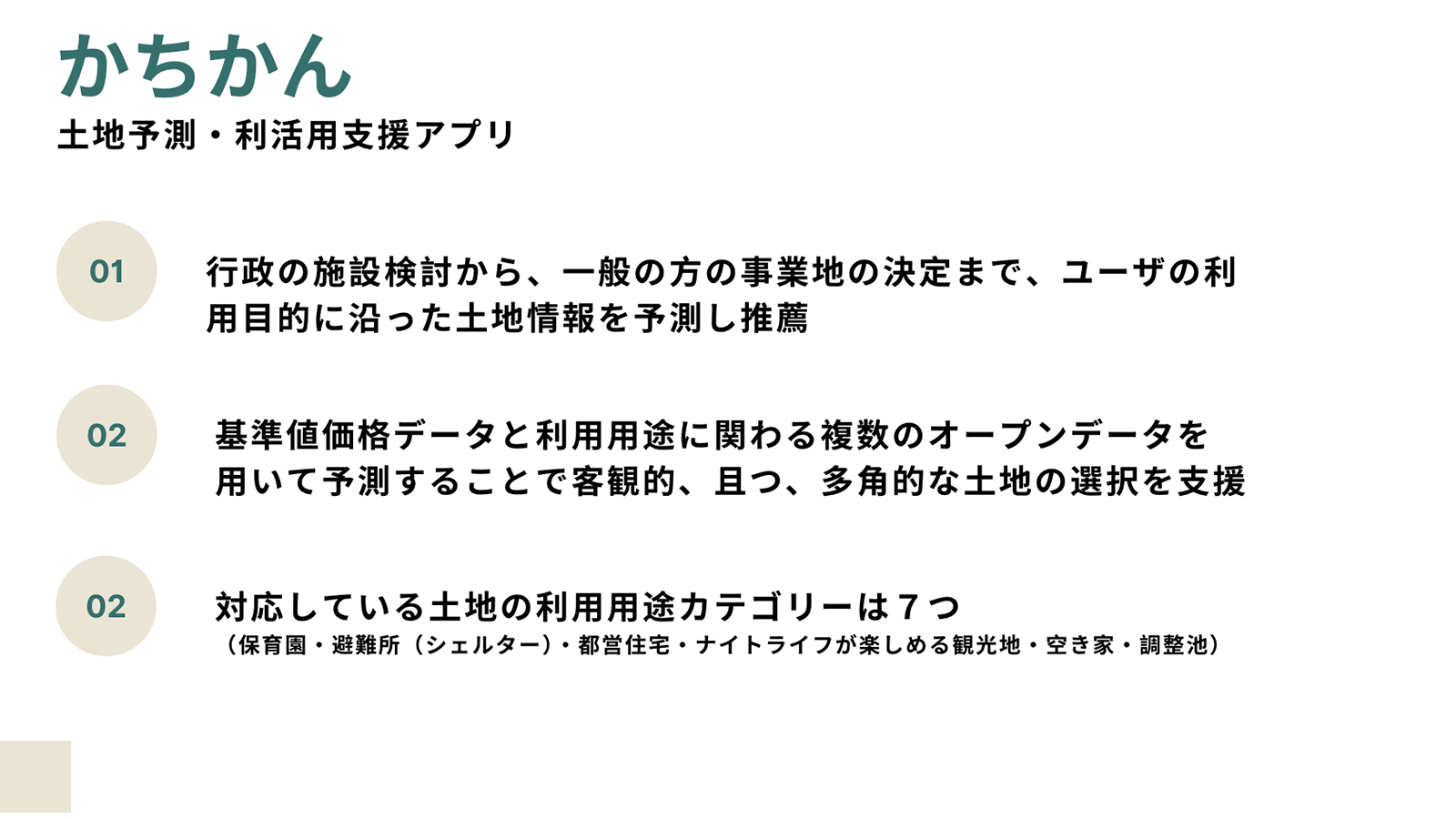 基準地価格データを基盤とした土地予測・利活用支援アプリ「かちかん」は、利用目的に沿った土地の周辺情報を予測する。アプリ上でユーザーが土地の利用目的や利用条件を回答すると、回答に基づいた基準値価格データと利用用途に関わるオープンデータを変数としてランダムフォレストと呼ばれる機械学習手法を用いモデルを作成し、ユーザーの希望に沿った土地がある地域を複数予測・推薦する。保育園から避難所、空き家物件まで様々な利用用途に対応しており、行政の施設建設の検討から一般の方の事業地、イベント開催地の決定まで、多様なユーザーの土地に関わる選択を客観的且つ多角的な観点から支援する。