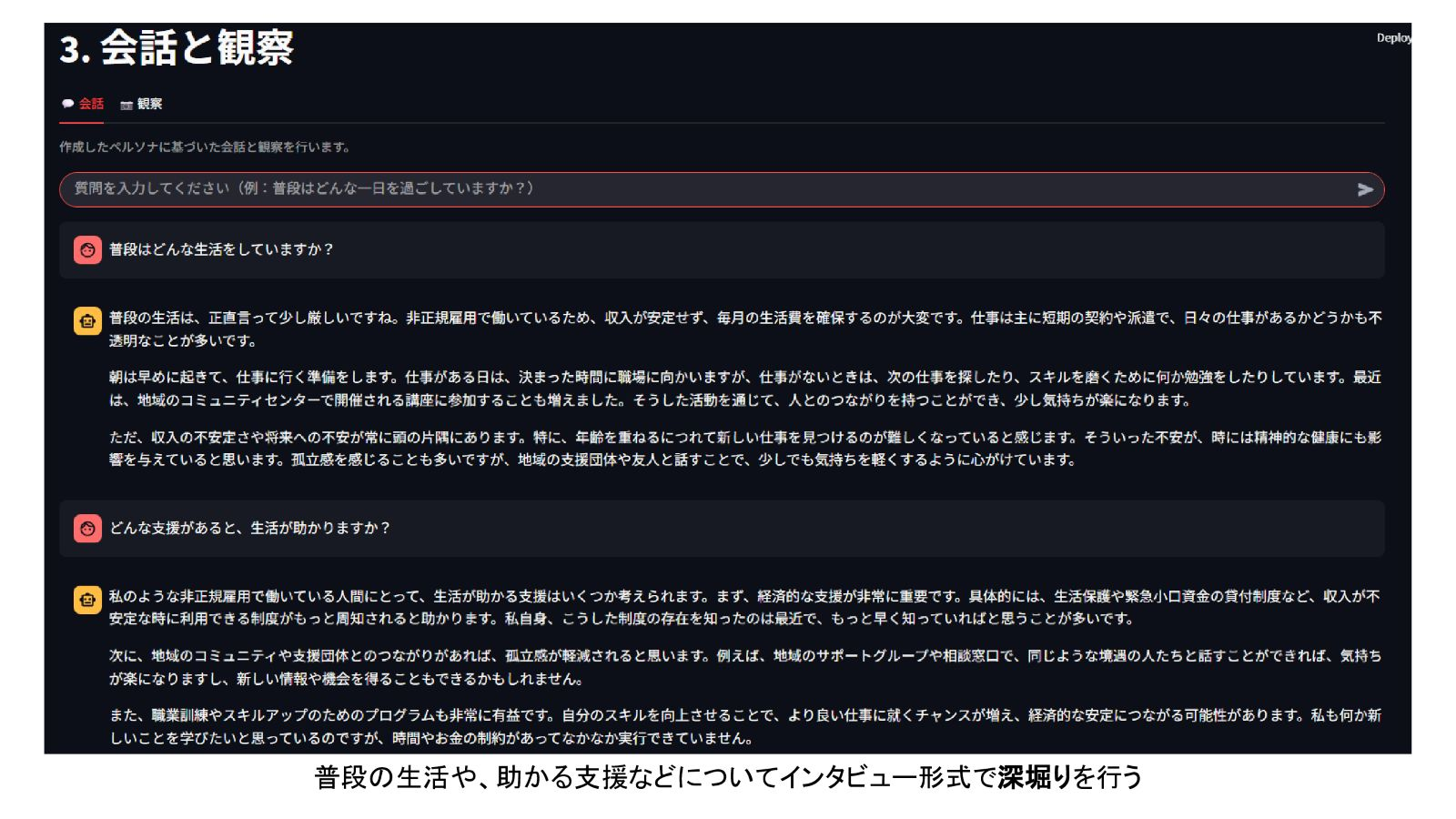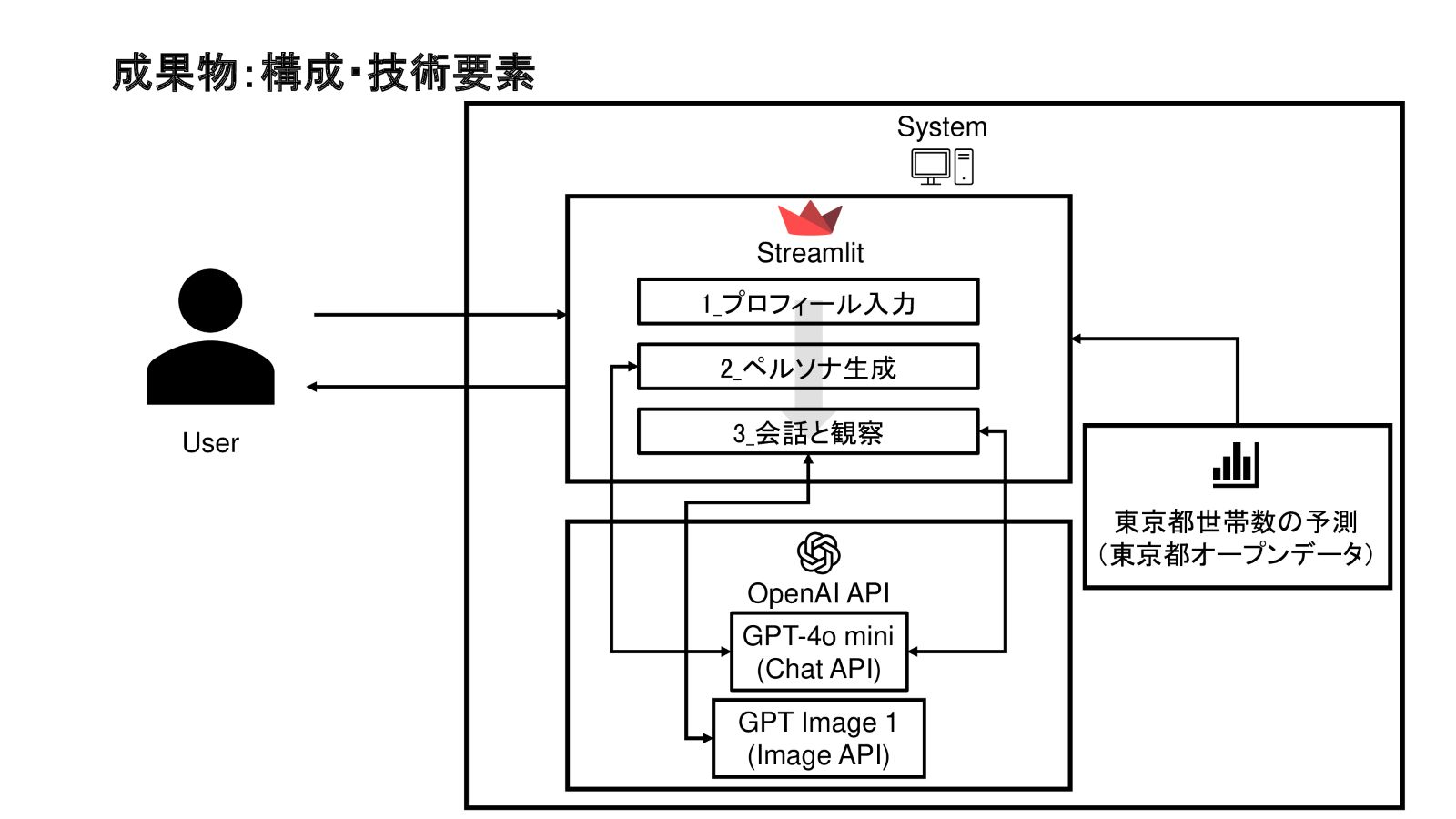 就職氷河期世代に関するアプローチを支援するための「PersonaBridge」を提案します。ユーザーは、Streamlitで構成されたプロトタイプに、年齢や居住地域などの情報を入力し、ペルソナを生成します。ユーザーはこのペルソナに対し、AIを活用した仮想インタビューなどを実施し、当事者の生活の実態や支援のニーズについてインタラクティブに探索できます。また、生成したペルソナ情報に基づき、東京都オープンデータを活用した世帯数予測などを表示することで、支援担当者の当事者に対する直感的な理解と深堀りの両方をサポートします。これにより、当事者のニーズを反映したアプローチや意思決定の支援を目指しています。