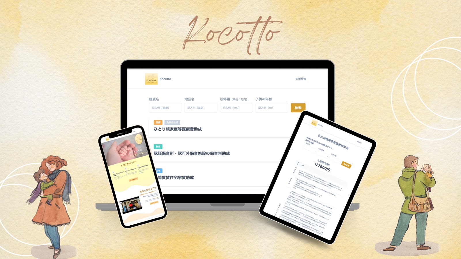 「ひとりおやは、ひとりじゃない。」Kocottoがあなたの味方になります。あなたに合った支援情報をお届け。制度の検索や自動でもらえる金額を出してくれます!今後は、プロフィール登録をして、検索無しで自分が受給できる制度情報を提供し、制度登録機能で更新時期をお知らせ!さらに必要な書類の作成も手伝ってくれるため、面倒な手続きも簡単に!より充実した生活を手に入れるお手伝いをKocottoがします!