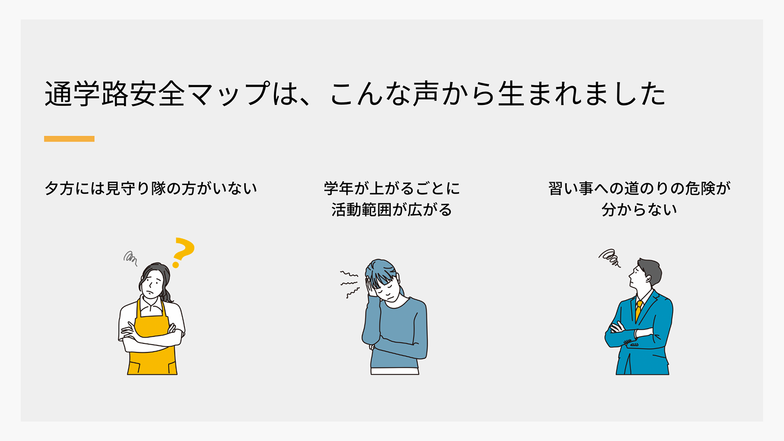 通学路安全マップは、東京都に住む親御さんが安心して子供を送り出せる社会を目指すためのサービスです。 東京都や警視庁が発表している過去の事故情報をマップ上に表示し、通学路や習い事に向かう途中の危険箇所を把握できます。