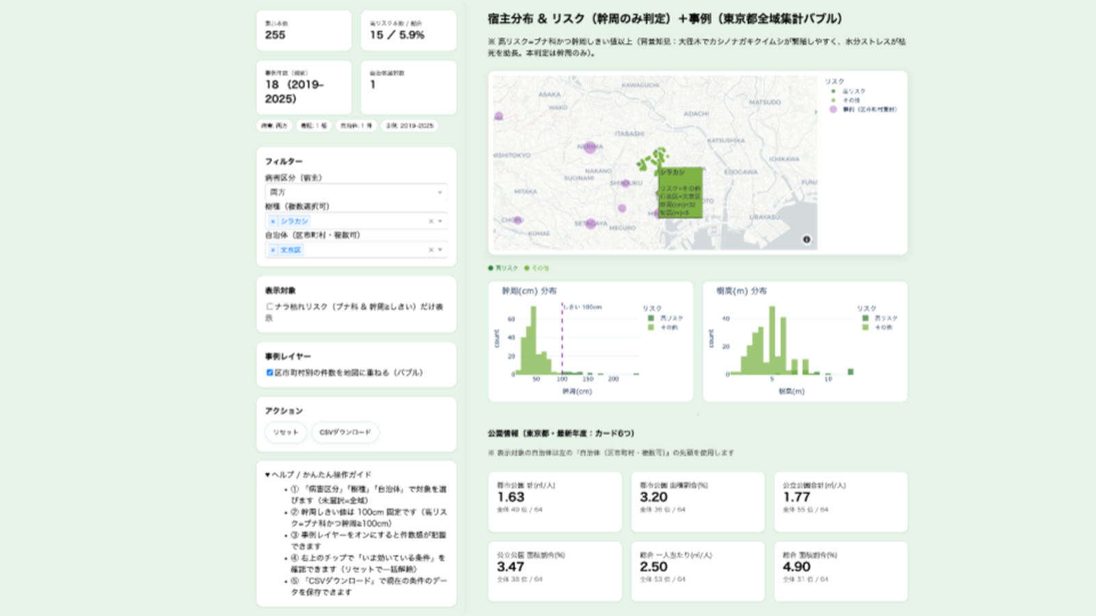 提案は、東京23区の街路樹と公園のオープンデータを横断的に結びつけ、マツ枯れ・ナラ枯れが生じやすい条件(樹種と幹周しきい値)に合致する木とそうでない木を分類し、地図と指標で直感的に可視化する。ダッシュボードでは区や樹種、条件を柔軟に絞り込み、自治体別の被害実例件数や、公園の面積割合・一人当たり面積などの指標を併せて提示する。これにより被害状況と被害可能性を一目で把握し、横断的な優先順位付けと説明根拠の共有を支援する。一画面で状況と影響を俯瞰し、管理境界を越えた連携と巡視・資機材配置の優先度判断につなげる。また、CSVファイルを差し替えるだけで他地域・被害事例にも適用できる。