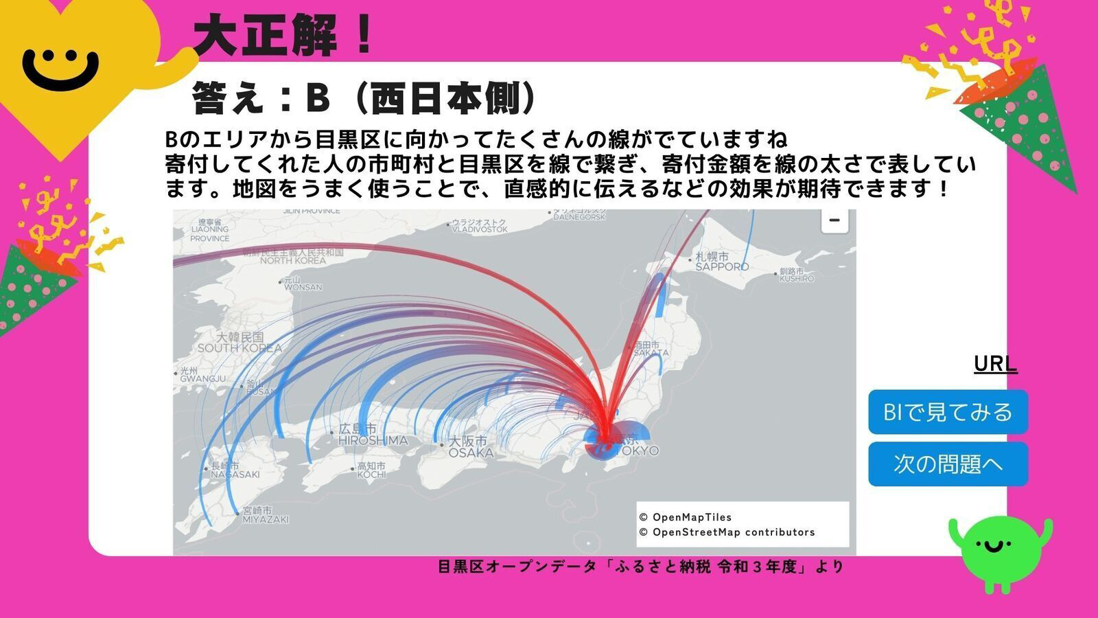 目黒区をはじめとした行政職員向けに、データ利活用の効果を実感できるクイズ形式のアプリを作成しました。 クイズは全3問で構成され、データ集計、地図での可視化、テキスト分析など、多様な手法を採用しています。また、行政職員が実務として使うイメージができるよう、クイズは全て東京都のオープンデータを利用しています。さらにデータ活用に興味を持った職員が一歩踏み出せるよう、実際の可視化に関するデータと手順も提供します。 本提案を通じて行政職員のデータリテラシー向上に寄与し、データ活用の推進に貢献できるものと考えています。【作品サイトは閉鎖済み】