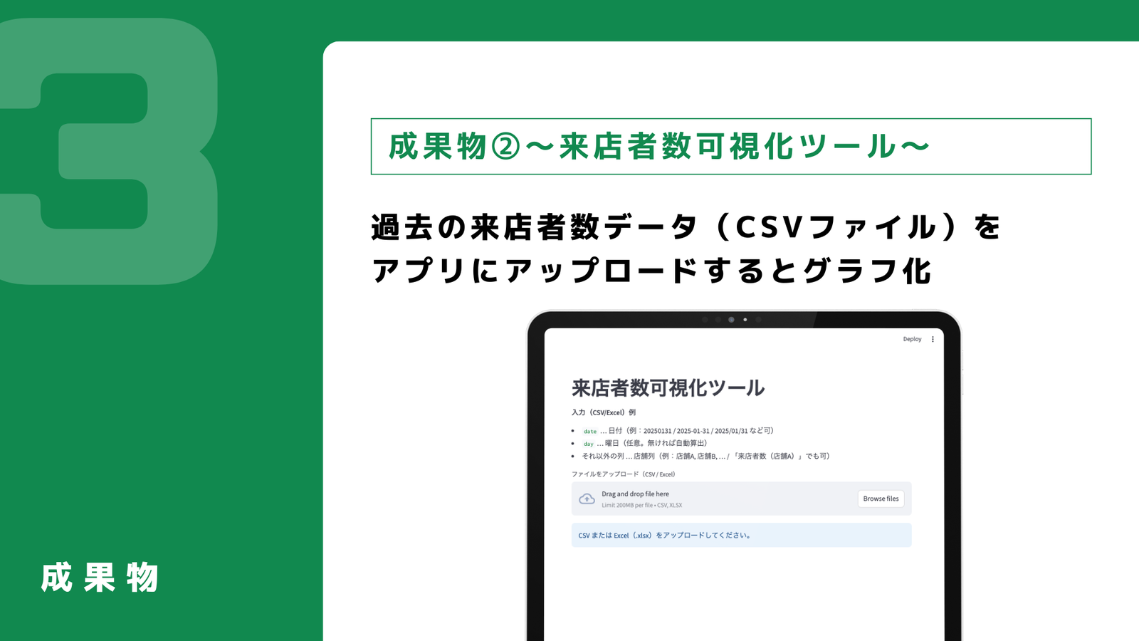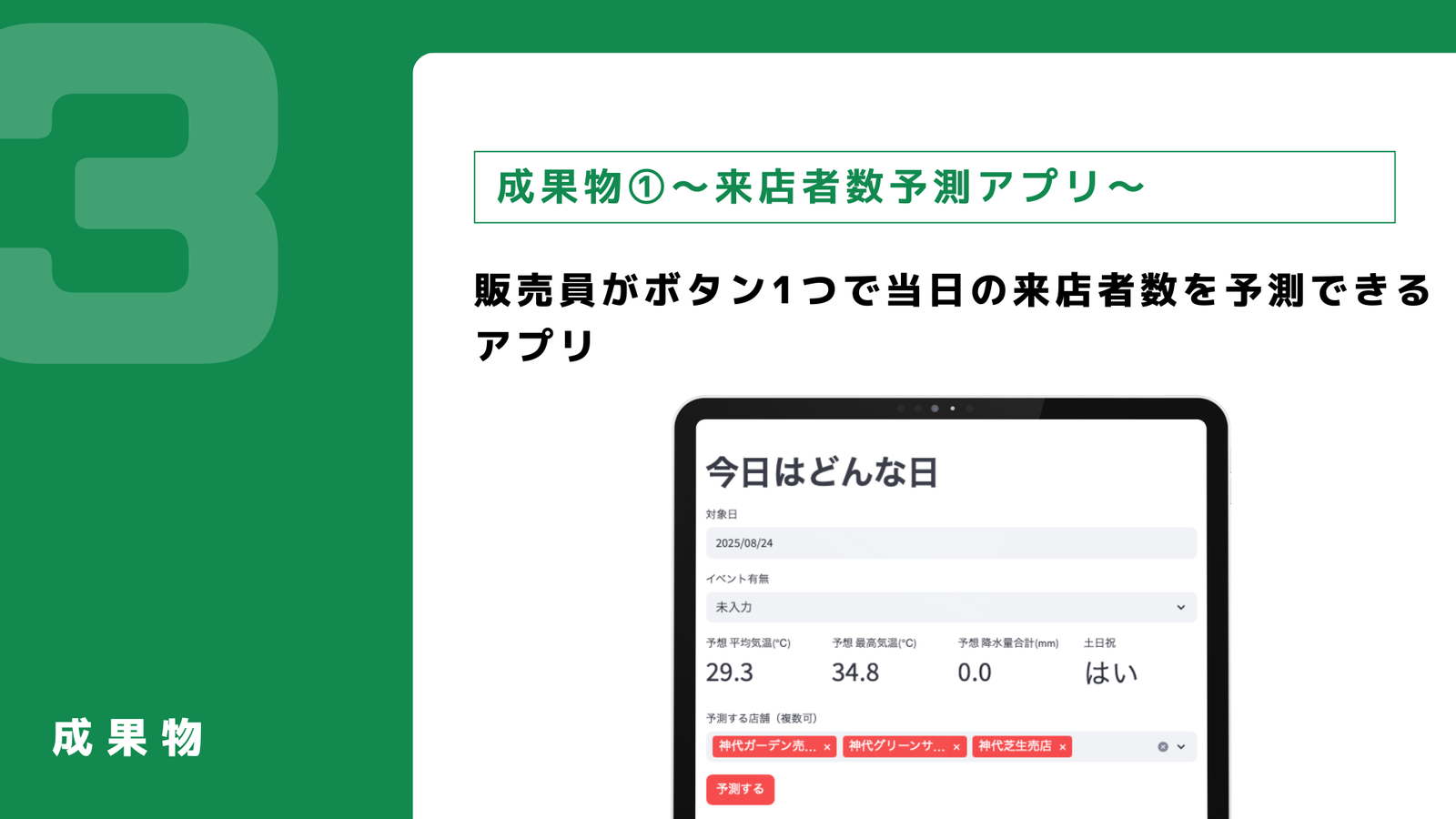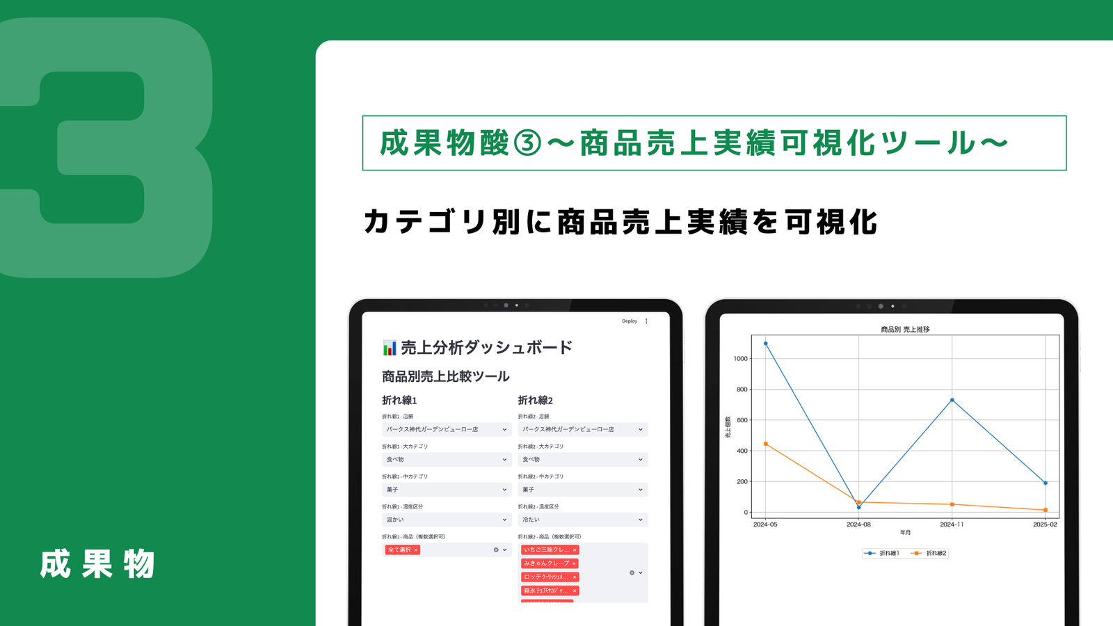 本課題に対し、需要予測を踏まえた公園売店の活性化を目的としてシミュレーション・データ可視化ツールを計3件開発しました。神代植物公園を具体的なターゲットとしています。1つ目は来店者数予測アプリで、平均気温などから予想来店者数を予測することができ、商品仕入れ数の最適化などに貢献します。2つ目は来店者数可視化ツールで、売店の運営計画を支援します。3つ目は商品売上実績可視化ツールで、2種の商品やカテゴリの売上を比較することができ、売上強化に有効な新商品開発に繋げることができます。