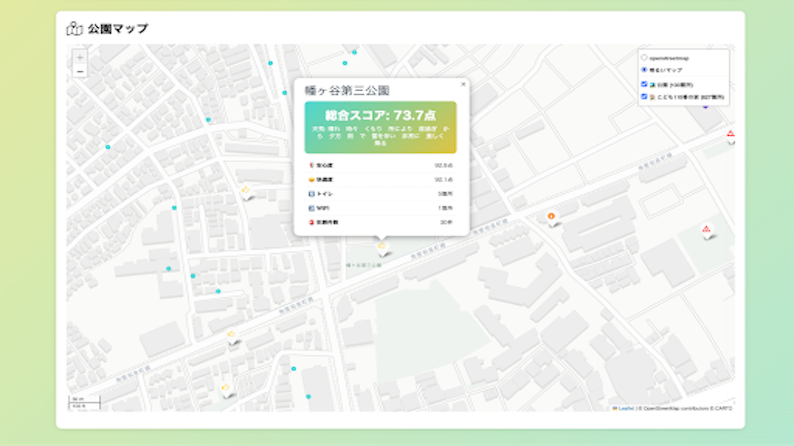 公園の安全度をスコアリングし、子育て世代が安心して利用できる公園を可視化するダッシュボードを開発しました。具体的には、公園付近の犯罪件数や「こども110番の家」からの距離、トイレの数や衛生面、さらにはリアルタイムの天気情報など、複数のデータを重みづけして総合的な「安全度スコア」を算出しています。これにより、子育て中の保護者が安心して子供を遊ばせられる場所を簡単に見つけられるようになります。また、親しみやすい子供向けのUIを採用することで、データに不慣れな一般区民も直感的に利用でき、渋谷区への安心感を高めることを目指します。