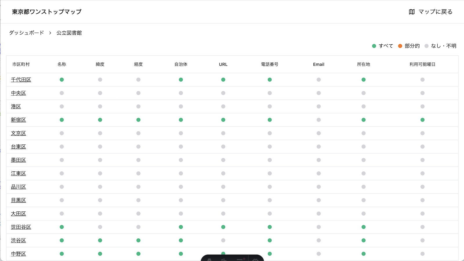 私たちが開発した「東京都ワンストップマップ」は、東京都のオープンデータを「ワンストップ化」するWebマップです。 ① 一般ユーザーは、様々なオープンデータの内容を、通常の地図アプリのように表示することができます。ユーザーは、自治体や種類を選択して簡単に情報にアクセスできます。それぞれの情報に応じて、このアプリの外の、様々なオープンデータの活用事例やアプリにも飛べるようにする予定です。 ② もう一つの機能として、マップで提供しているデータのダッシュボードも開発しました。行政の担当者や、データを利用したい開発者は、データの種類ごとに各自治体のデータ網羅状況やデータの内容を一目で把握できます。データは複数自治体のデータを利用しています。(追加中)