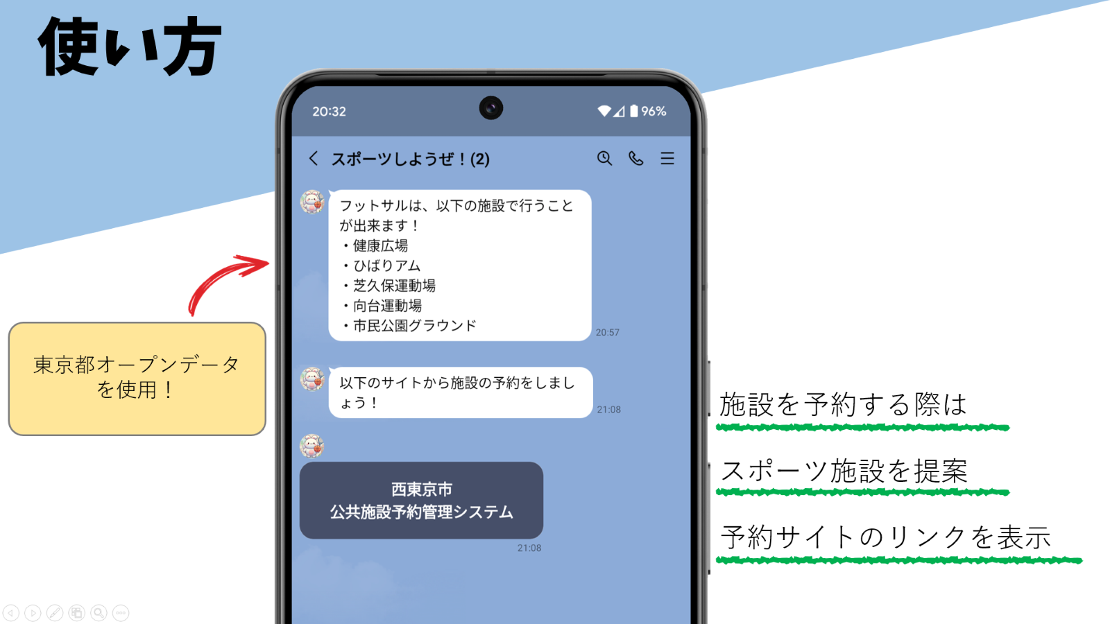 西東京市民の「現在、運動やスポーツを行っていない。しかし、6か月以内に始めようと思っている。」層をターゲットにしたLINEBotサービス コンセプトは「主体性」の向上で、AIが主体で予定を決めるのではなく、自分たちで予定を決めるお手伝いをするサービス