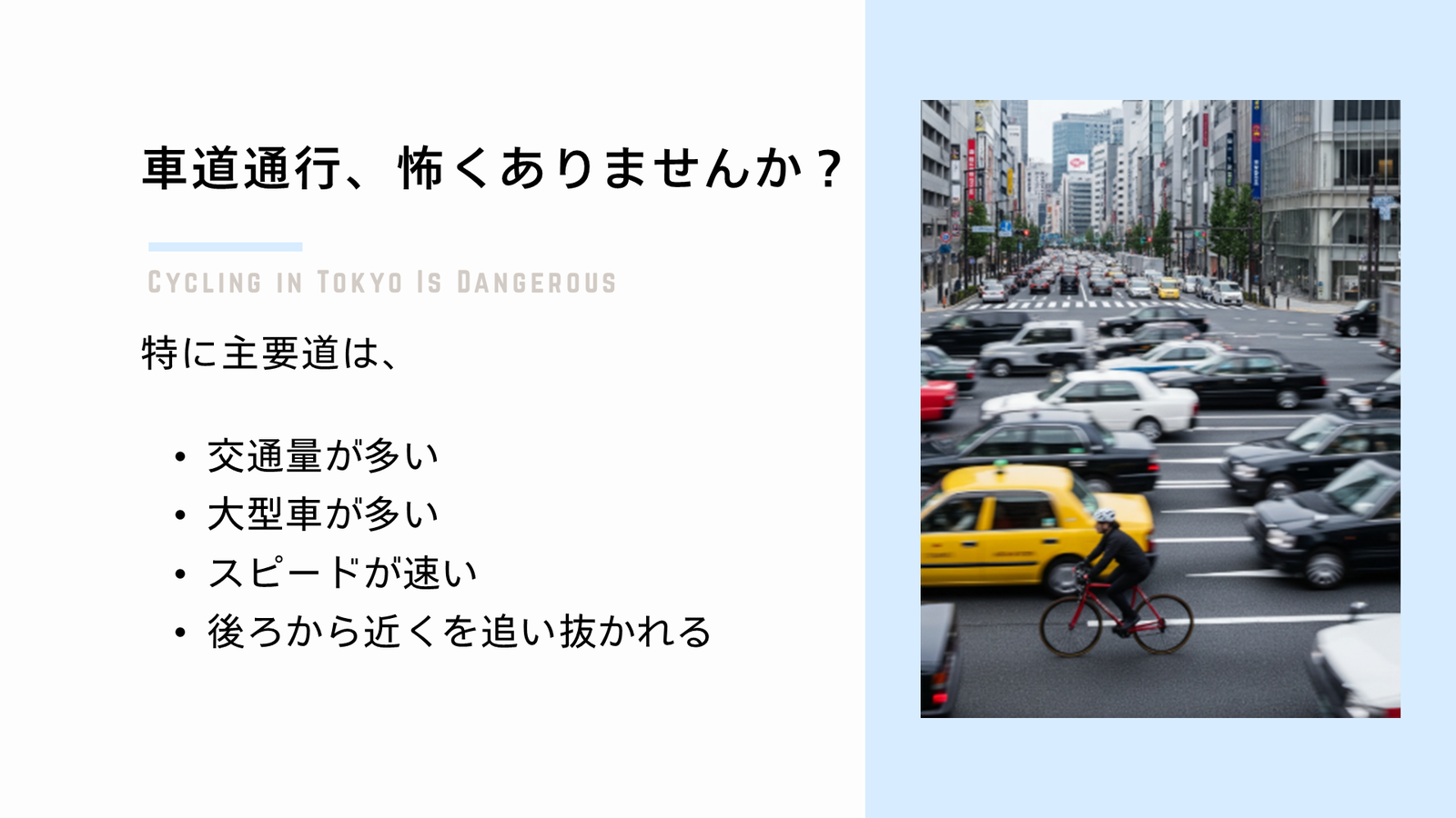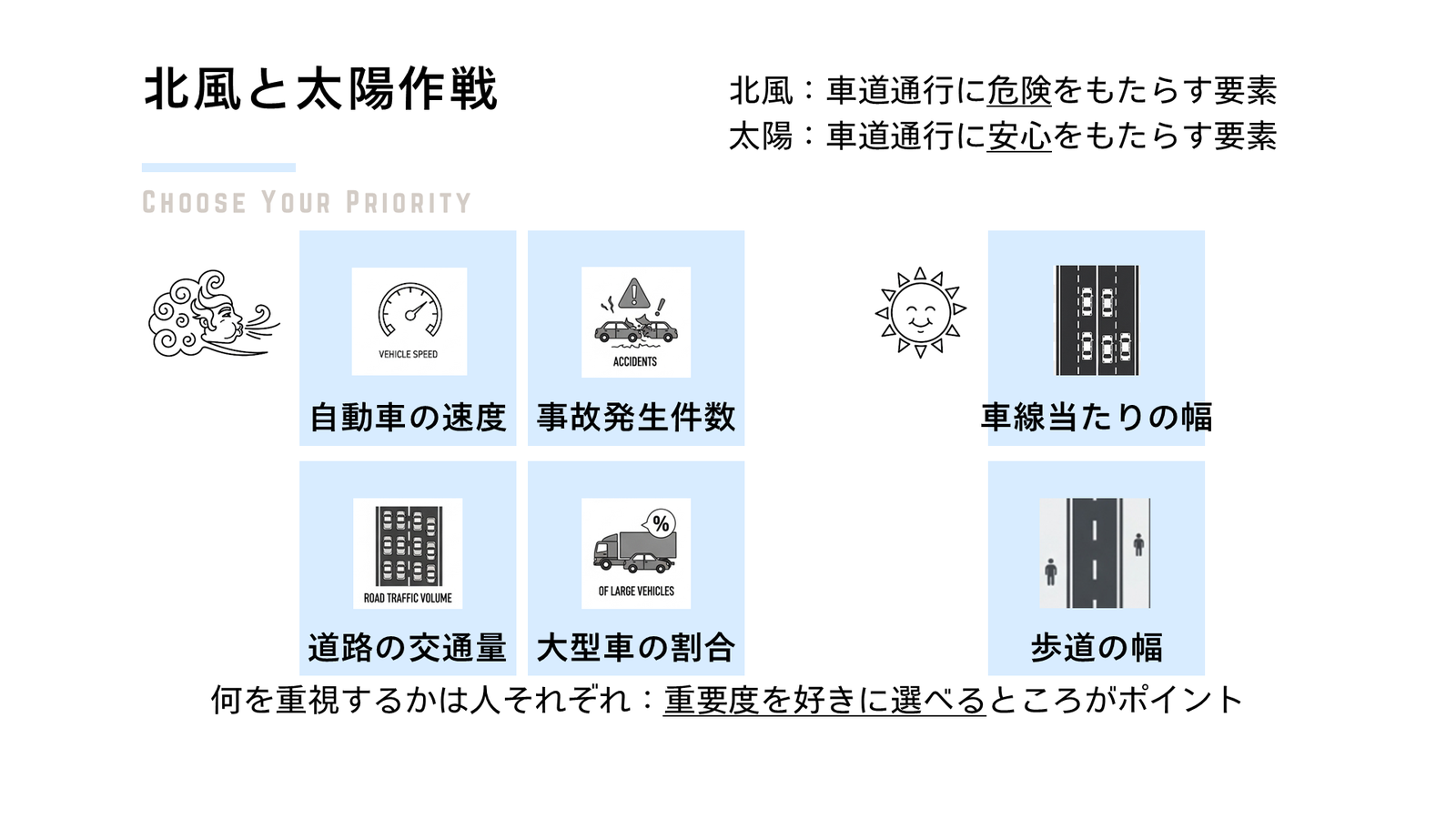 「北風と太陽サイクリング」は、交通量統計表や道路交通センサス、事故データ、地理院地図、PLATEAUなど多様なデータを統合し、「車道通行で気を付けるべき区間」と「歩道通行が危険な区間」を可視化できる。ユーザーの走行スタイルに合わせて重みづけを調整できる点に強みがある。さらに重みづけする要素を「北風」(通行の危険性が高くなる要素)と「太陽」(通行がしやすくなる要素)に分け、ユーザーが直感的に選択できる工夫をしている。これにより、単なる地図ではなく「自分に合わせた安全ガイドマップ」として活用可能になり、安心して車道通行が容易な自転車通行ルートを計画・選択できる環境を提供する。