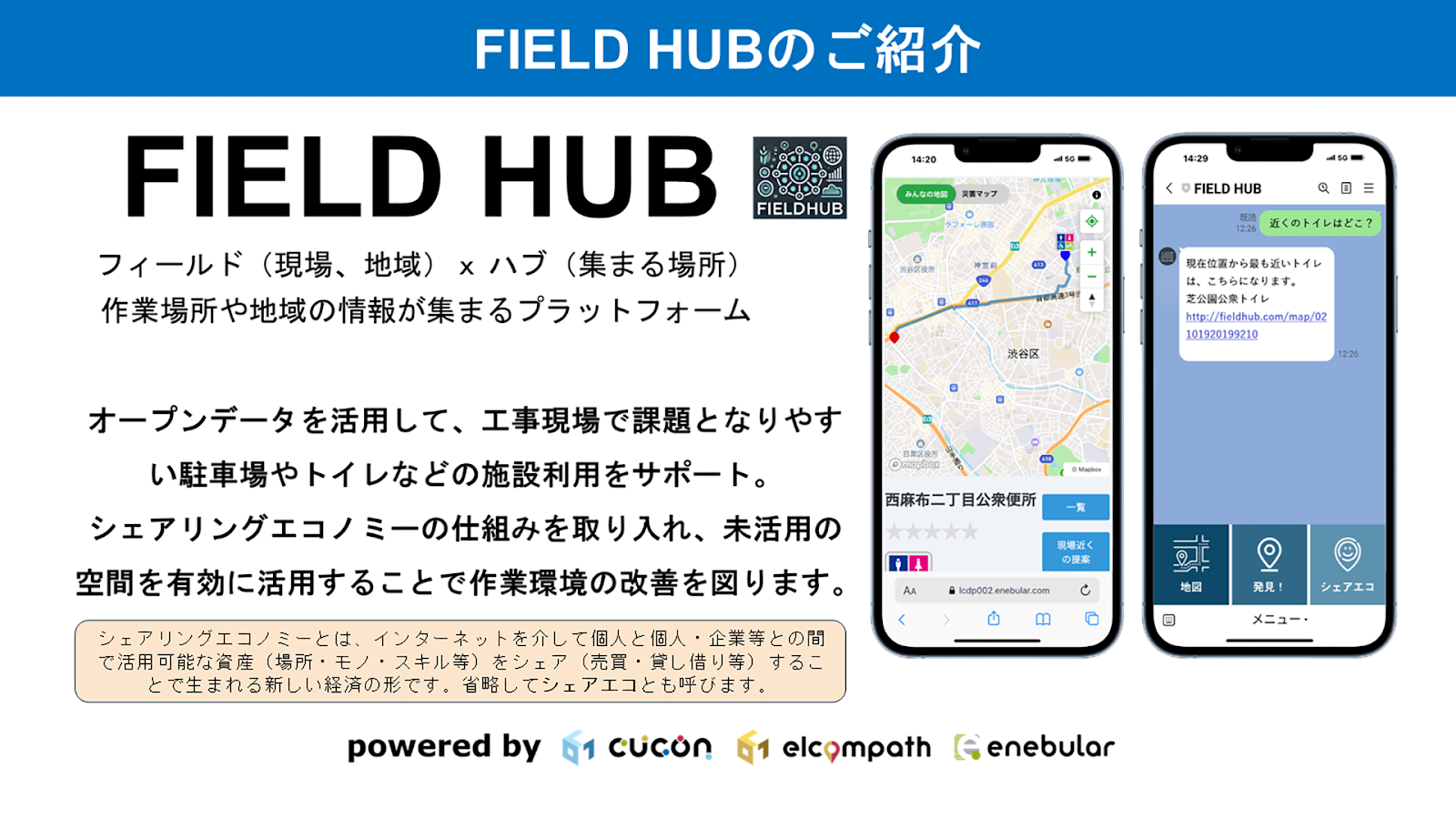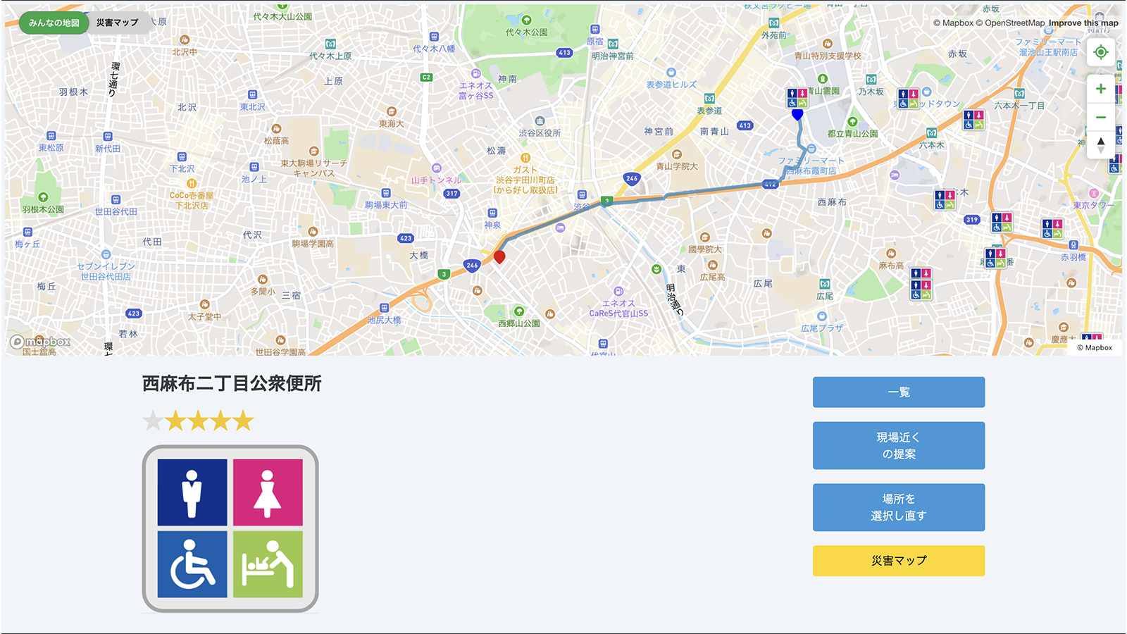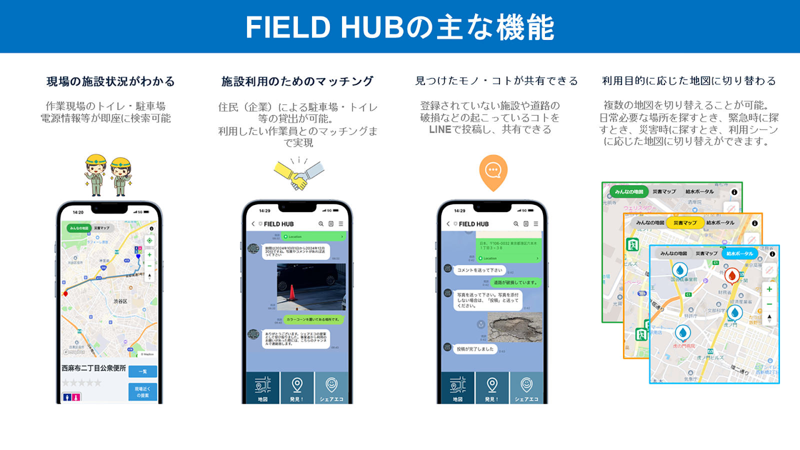 東京都下水道局の課題である路上工事事業者の作業環境を改善するため、オープンデータを活用し事業者向けアプリ上に駐車場、トイレ、電源等の状況を地図上に可視化します。また都民向けアプリも用意しオープンデータによる工事情報を地図上で確認できるとともに災害時等に上記情報を可視化できるようにします。オープンデータで不足する情報を補完するため、都民向けアプリに活用可能な駐車場等の投稿機能を実装し、事業者とのマッチングが可能になります。 事業者は必要かつ適切な情報を閲覧収集できるようになり、都民は空きスペースやトイレなどの有効活用ができることと災害時のライフライン確保を実現します。