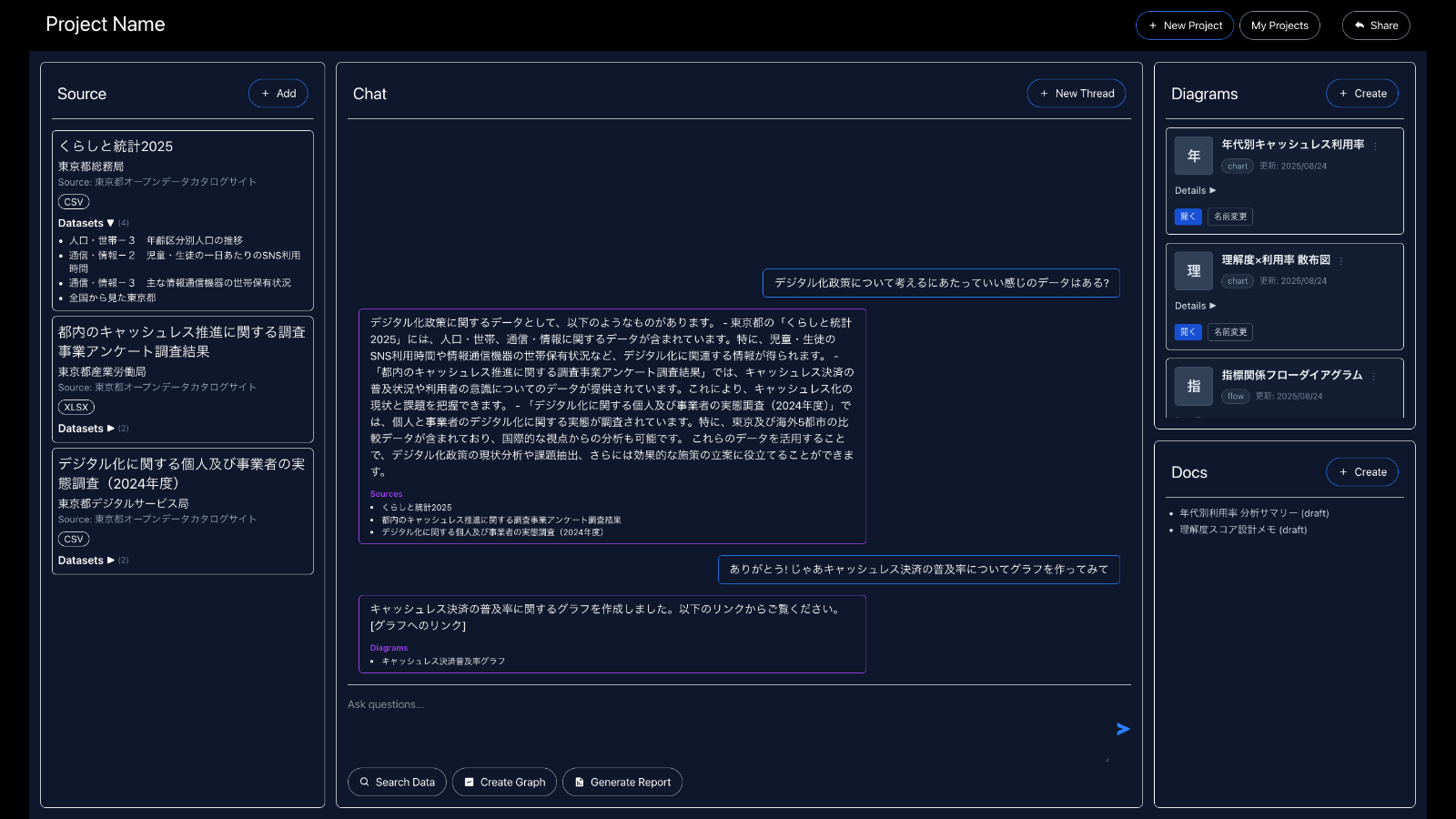 このサービスは、ユーザーが対話型AIを利用しながらデータの調査・分析・可視化を可能にするものです。データの調査・分析を繰り返しながらレポートを作成していくことができます。ユーザーの抱えるテーマをもとにオープンデータカタログから最適なデータを検索し、提供します。その後、ユーザーの要望に応じてグラフや表、図といったものによって可視化したり、それらを利用してレポートを作成することができます。これらの機能によって、データを利活用する研究を支援します。