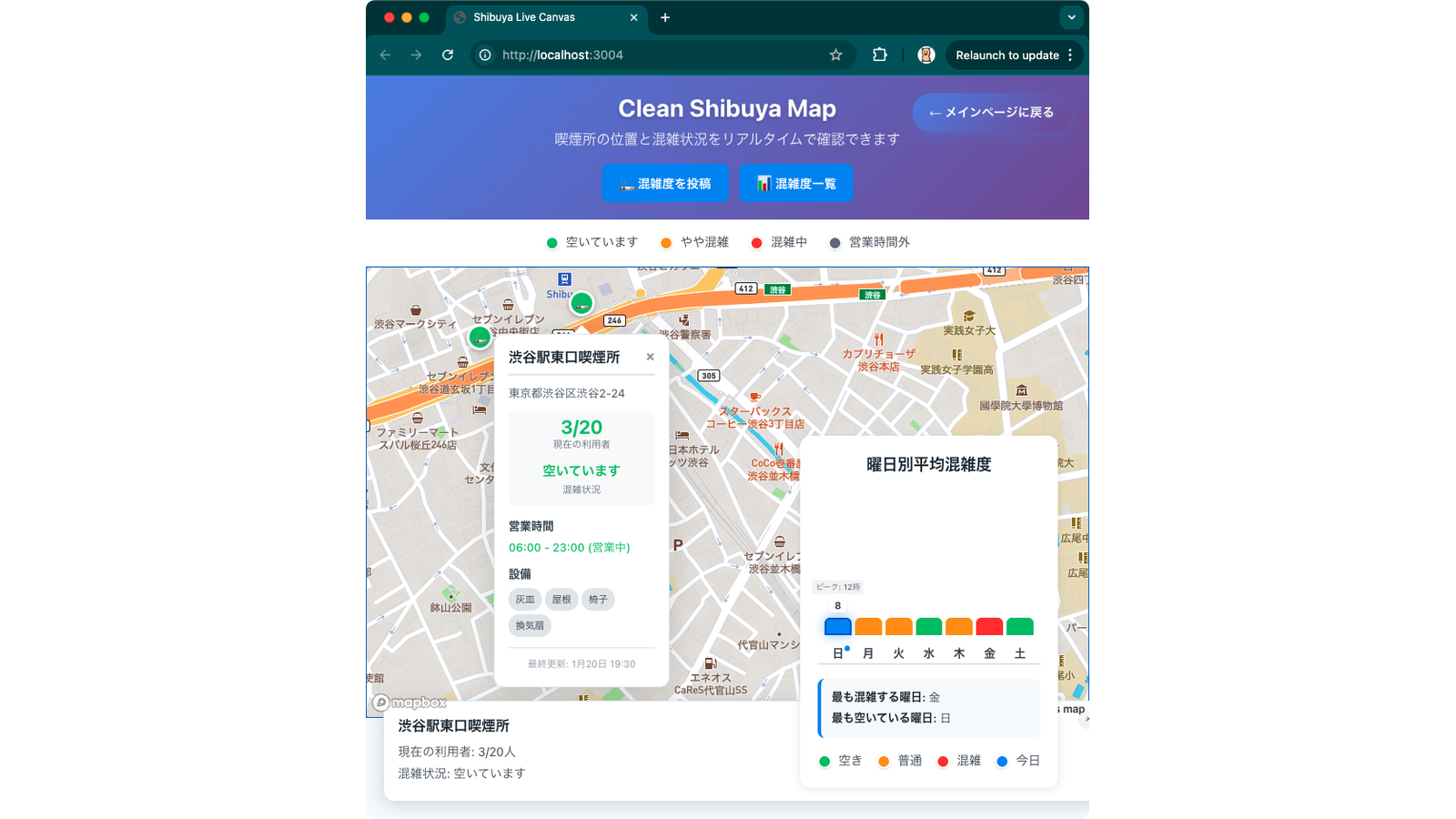 本提案では、渋谷区の喫煙対策を強化するため、オープンデータと市民参加型データを融合したアプリ「Clean Shibuya Map」を開発する。区内公共喫煙所の位置をマップ化し、利用者投稿によりリアルタイム混雑状況を共有、路上喫煙違反の報告機能も搭載する。さらに渋谷区の指導・過料件数等のオープンデータを可視化し、パトロール重点日時や地域の特定を可能にすることで、行政コストを年間約8,500万円〜1億円削減できる見込み。利用者にとっては安心できる喫煙環境が整備され、非喫煙者・観光客にとっては受動喫煙の少ない快適な街歩きを実現する「未来の東京」戦略の一翼を担う成果物となる。