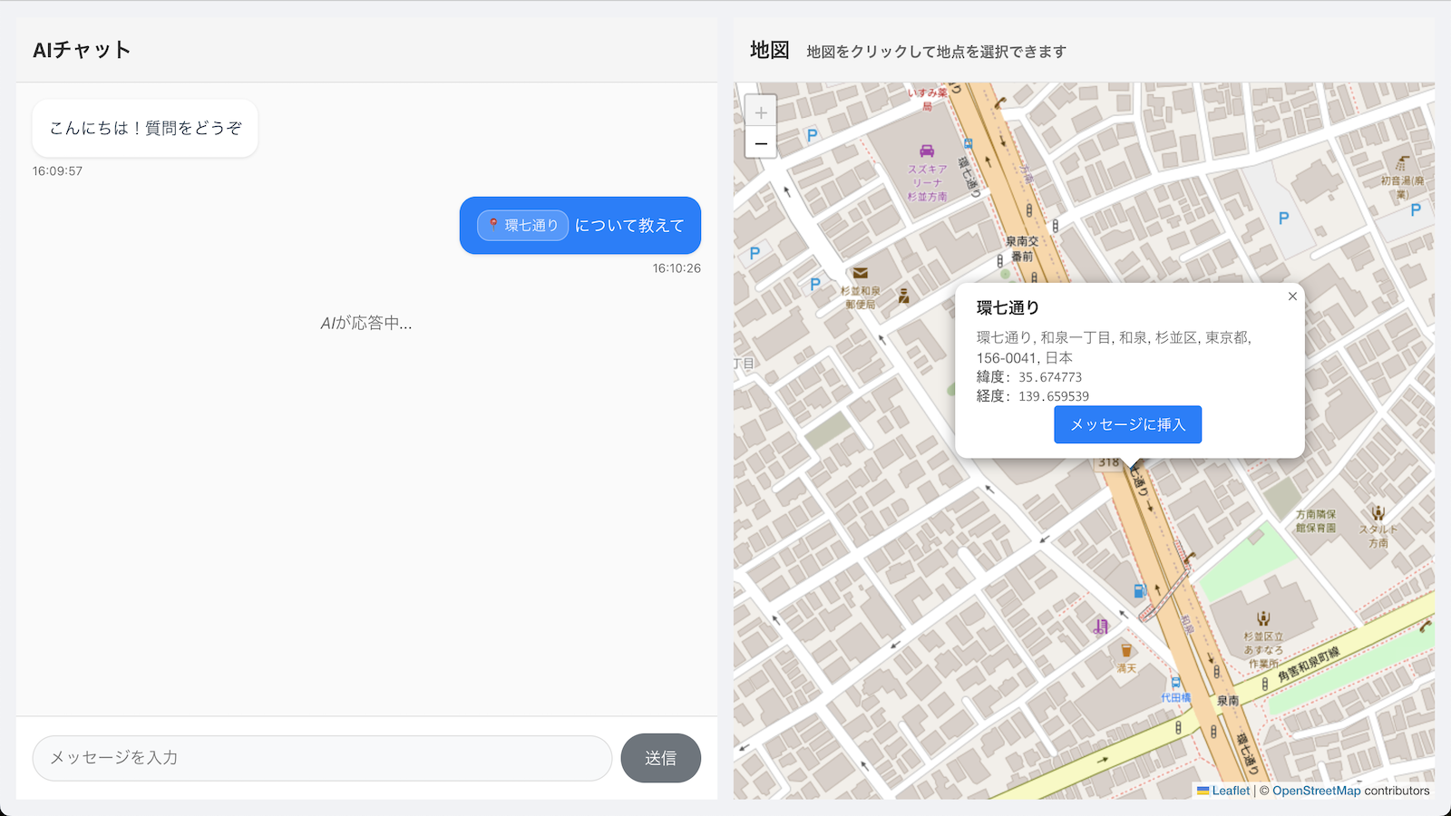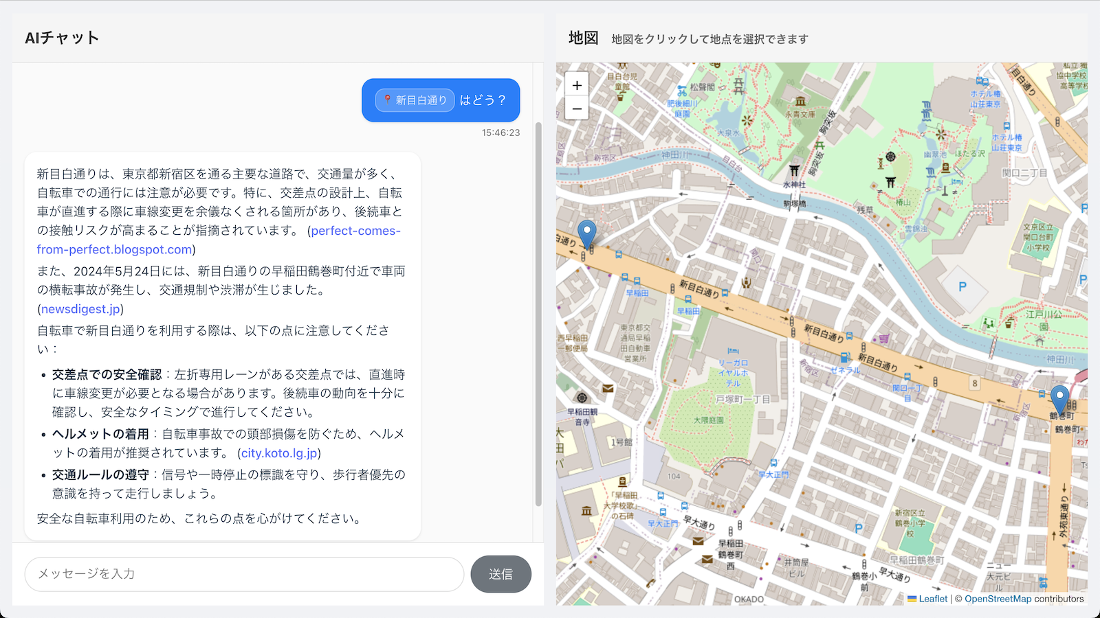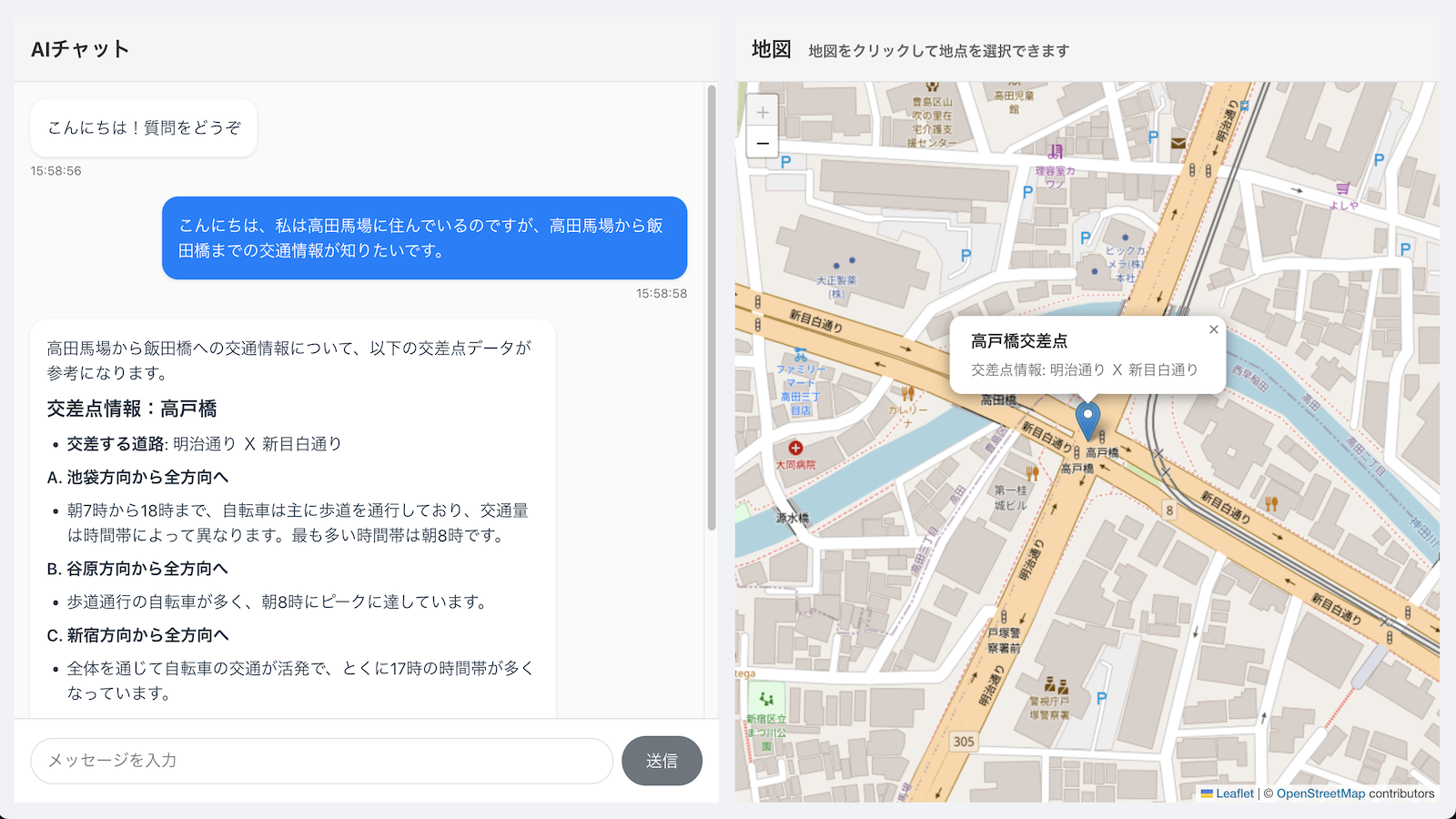本提案の成果物は、チャットと地図インターフェースを組み合わせ、対話を通じて地域交通の理解や資料作成を支援するツールである。利用者は地図上で特定地点を選択し、その地点に関する質問をチャット画面から入力できる。 システムは入力を受けて交通情報を検索し、自然言語での回答を提示するとともに、関連要素を地図上に補足説明付きで表示する。参照する情報には、交通量統計のオープンデータや自治体が整備した自転車道ルートなどが含まれる。 生成された回答と地図上の補足情報はチャット画面に併せて表示され、利用者は追加の質問を行ったり、得られたデータを基にガイドラインを作成したりできる。