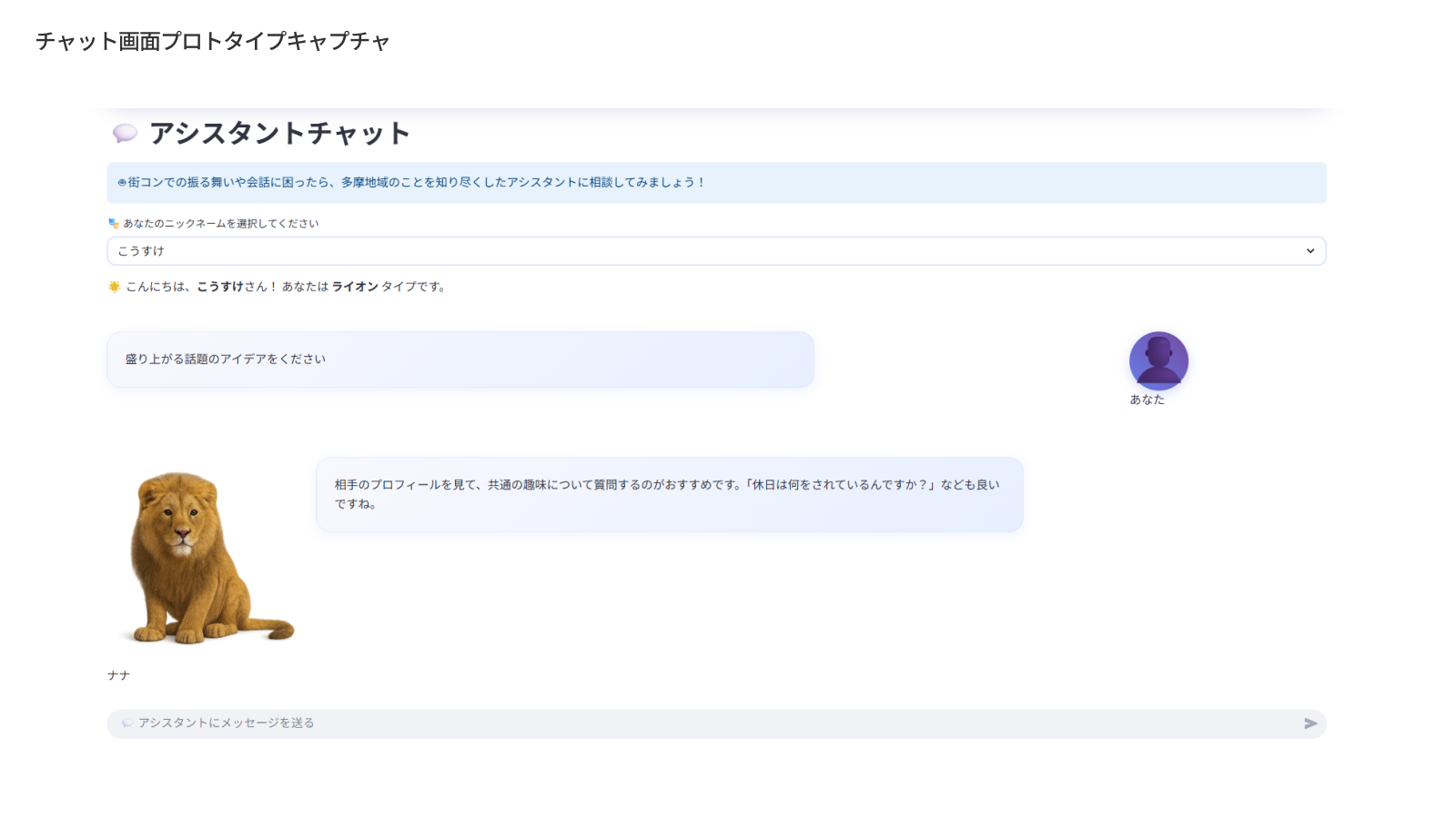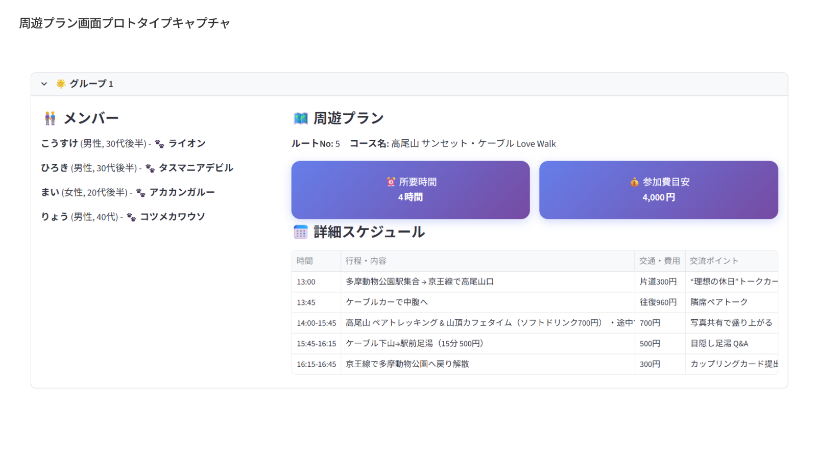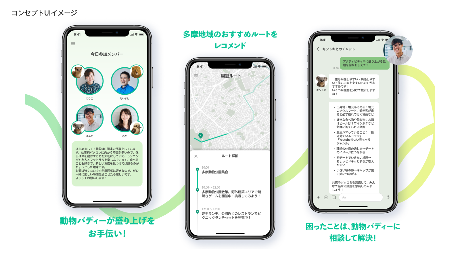 人と人が繋がる街コンと多摩動物公園の特色を組み合わせることで、「今まで発信しきれなかった地域の魅力発信」と「持続的な関係人口の創出」へ繋げる。 街コンを支援するアプリが成果物となり、多摩動物公園以外の魅力や広がりを創出するため、おすすめ観光地を組み込んだ周遊ルートを自動生成する機能を実装した。 また、多摩動物園の特色を活かし、街コン参加者に対して多摩動物公園の動物モチーフとしたコミュニケーションサポート機能を実装した。 そして、多摩エリアでのコミュニケーション・出会いを思い出とすることで、エリア横断的な関係人口創出による持続的な地域活性化を目指すことができる。