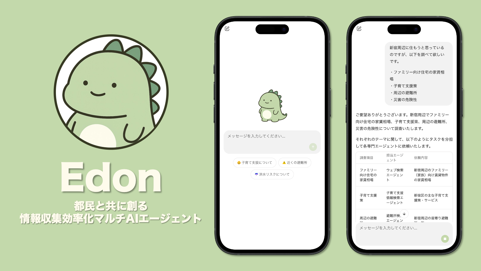 Edon(情報収集効率化マルチAIエージェント)という統合プラットフォームを開発しました。本システムは、避難所検索AI、子育て支援制度検索AI、浸水予想検索AI等の専門特化型AIエージェント群をスーパーバイザーAIが統括し、都民からの自然言語での問い合わせに対して横断的な情報収集・整理・回答を自動実行します。都知事杯等でのアイデアをエージェントとして追加したり、技術的なことがわからない方でも便利なプロンプトを作成したり、都民の参加によって、より便利になるという特徴を持っています。こうしたAI機能を搭載することで、東京アプリが都民にとってより身近なものになるのではと考えます。