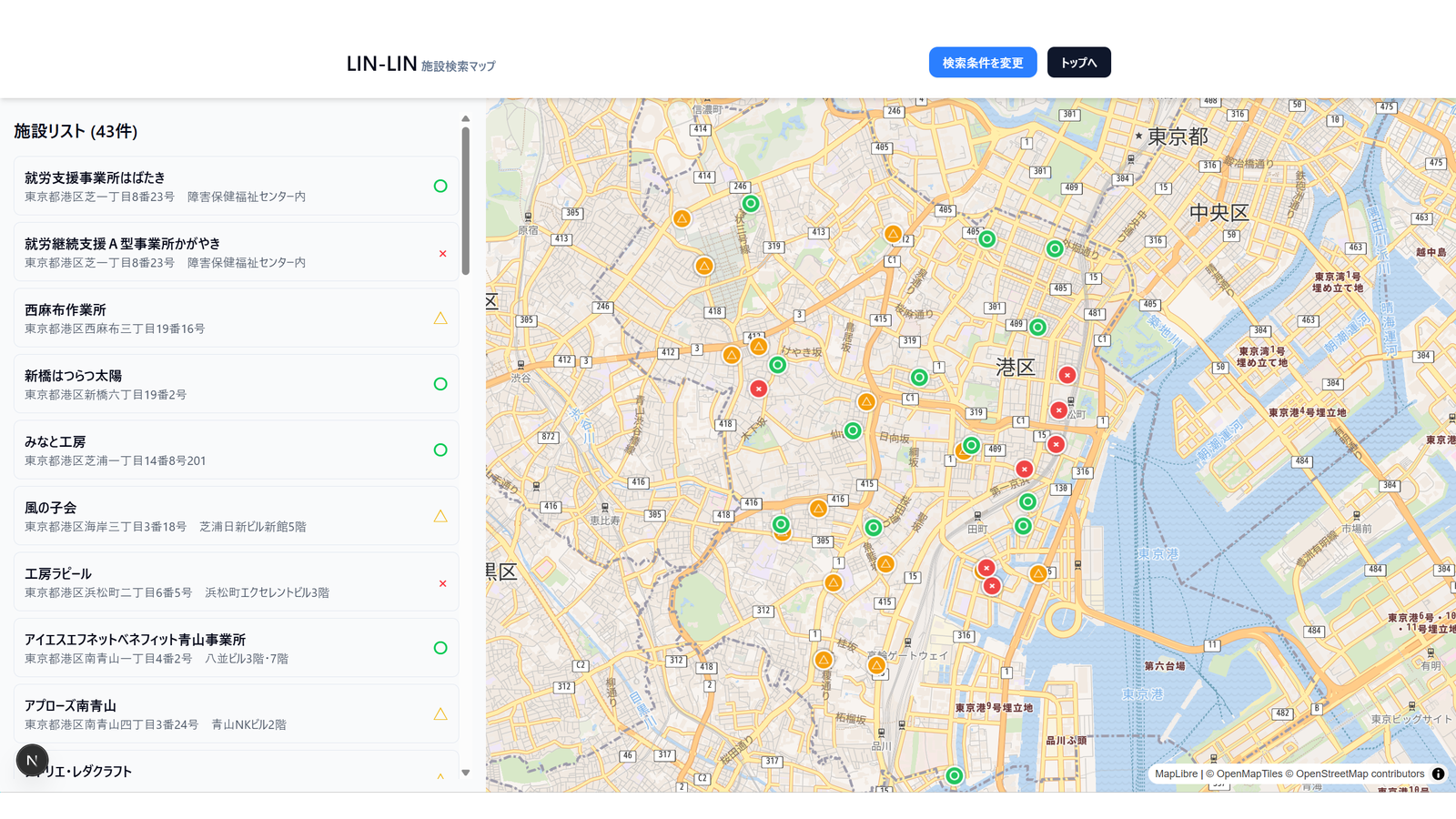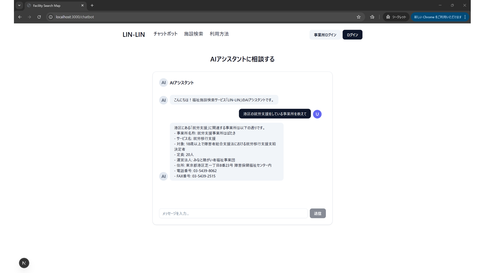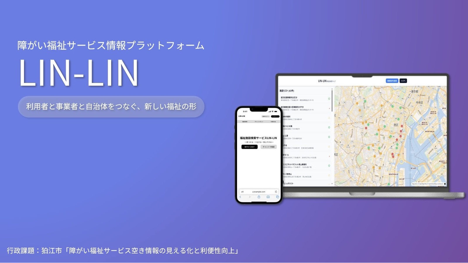 「LIN-LIN」は、狛江市の行政課題である「障がい福祉サービス空き情報の見える化と利便性向上」に対するソリューションとして、チームBPSDが開発したサービスです。 利用者、事業者、自治体をつなぐ新しい福祉の形を目指し、分散した空き状況や施設情報、障がい者福祉情報を一元化し、利用者と事業者をつなぐ情報プラットフォームとなるよう作成しました。 主要機能は「条件検索」、「施設詳細ページ」、「AIエージェント」、「空き状況更新フォーム」の4つで、誰もが簡単に「見つかる・つながる・安心できる」をコンセプトに障がい福祉の新しいスタンダード構築を目指しています。