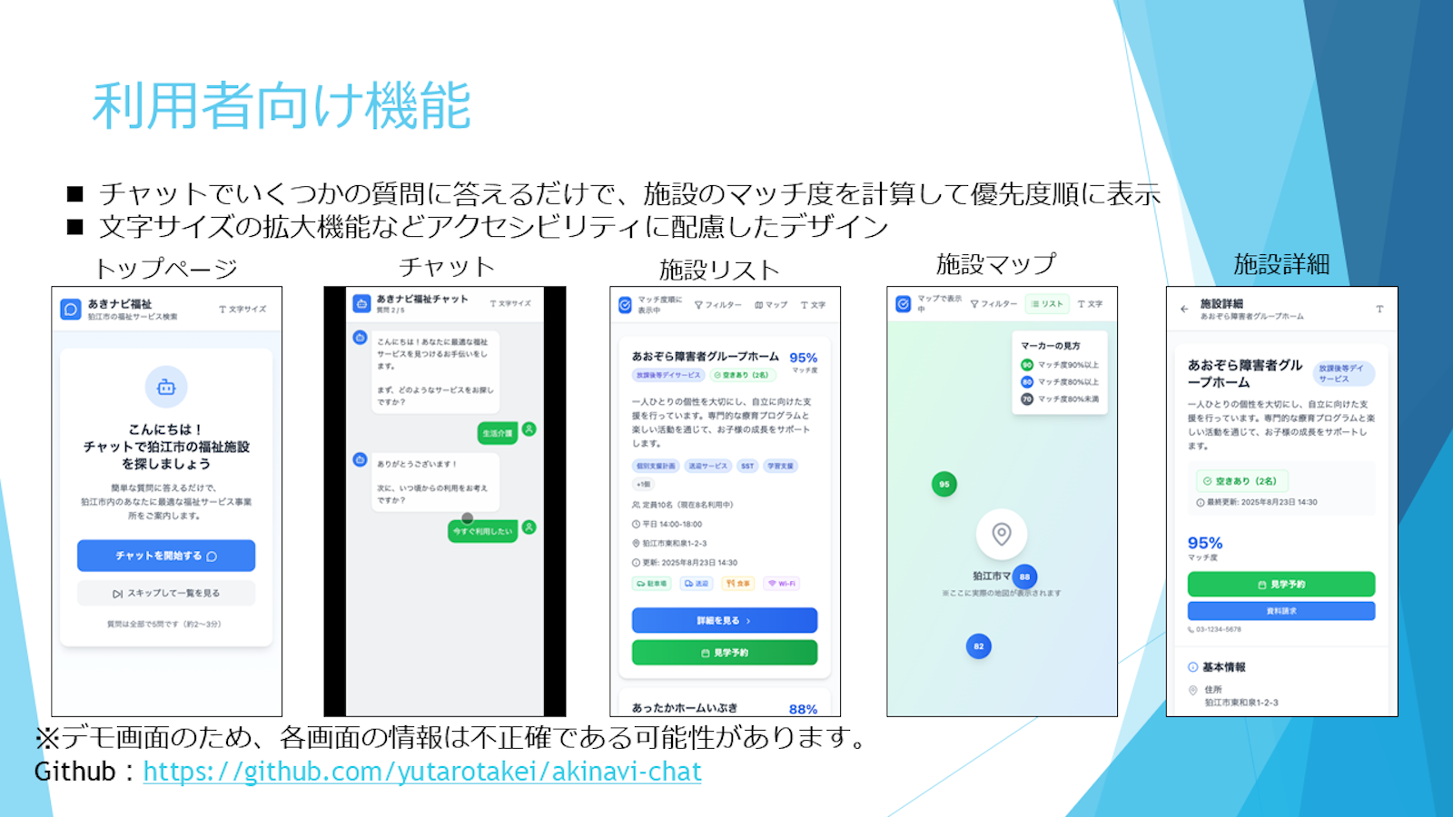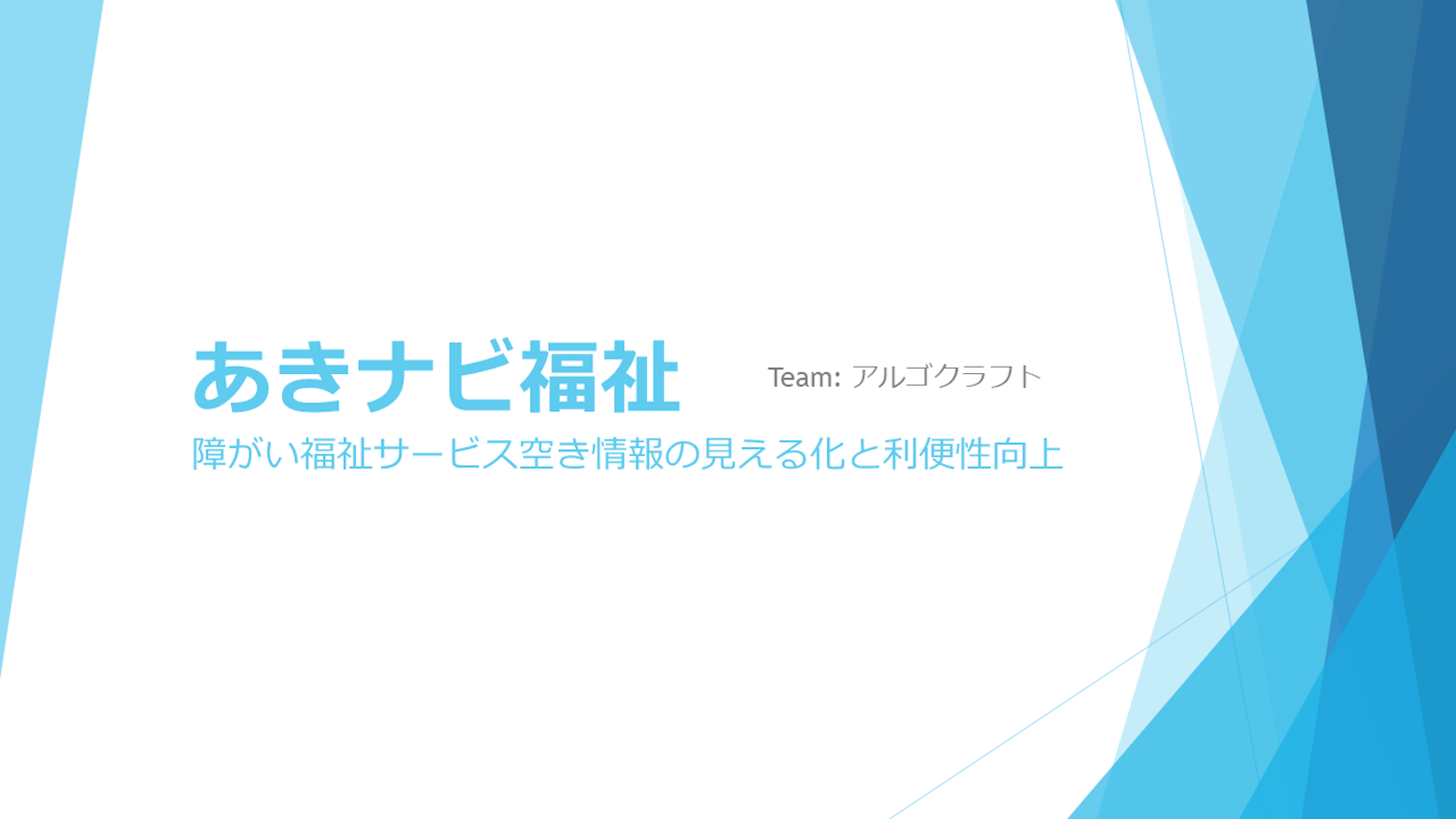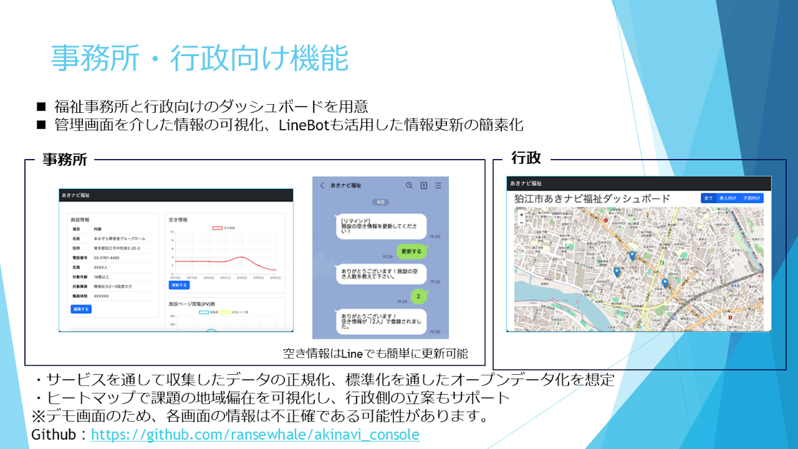 福祉施設の空き情報を統一・可視化する「あきナビ福祉」プラットフォームを提案します。本プラットフォームでは、利用者はチャット形式で希望条件を伝えるだけで、最適な施設の候補リスト、地図、詳細情報を入手でき、更新通知も受け取ることが可能です。また、事業所や行政機関向けには、空き情報を容易に更新できる管理画面を提供し、ダッシュボード機能によりデータ集計、ヒートマップ表示、詳細分析を通じて、地域の福祉状況把握と効果的な施策立案を支援します。LINE Bot連携やアクセシビリティにも配慮した設計です。