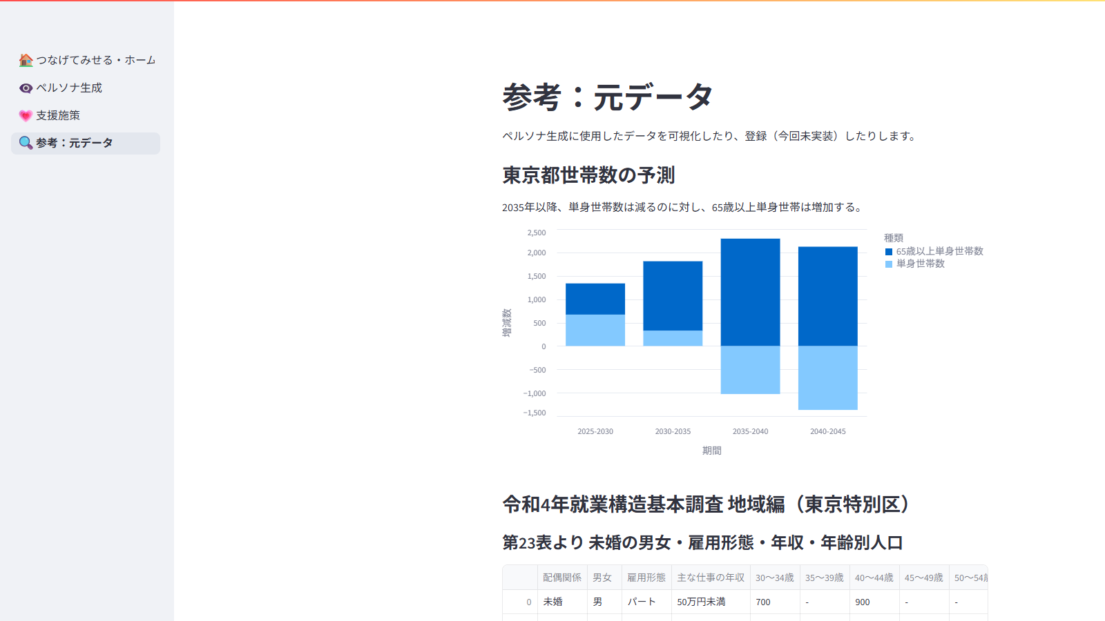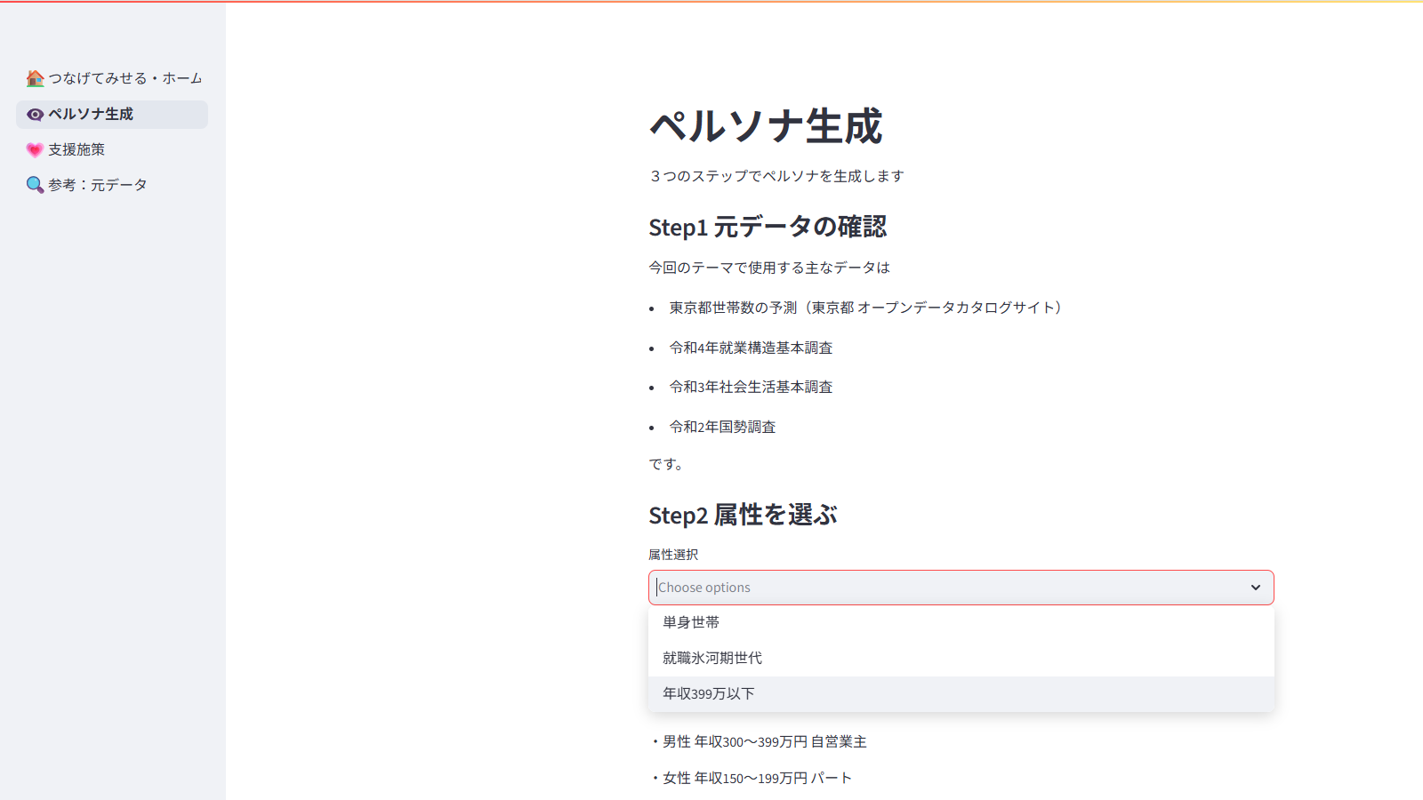 機能:①オープンデータを生成AIで分析、出力結果からペルソナを表示する。②生成したペルソナを1.中野区内の利用場所、2.現時点でありうる困難、3.将来的な困難に要約し、中長期的な支援策を考えるためのアイディアメモを登録する。③利用したオープンデータを閲覧する。制作の意図:行政課題ワークショップにて、「SOSを言えない人の実態を把握できていない。アンケートやインタビューを行うにしても、相手の自尊心を傷つけてしまう恐れがある。それでも何かしらの支援を届けたい」と話されていた。傷つけることなく実態を把握し、支援策を試行錯誤するためのツールとして「つなげてみせる」を制作した。